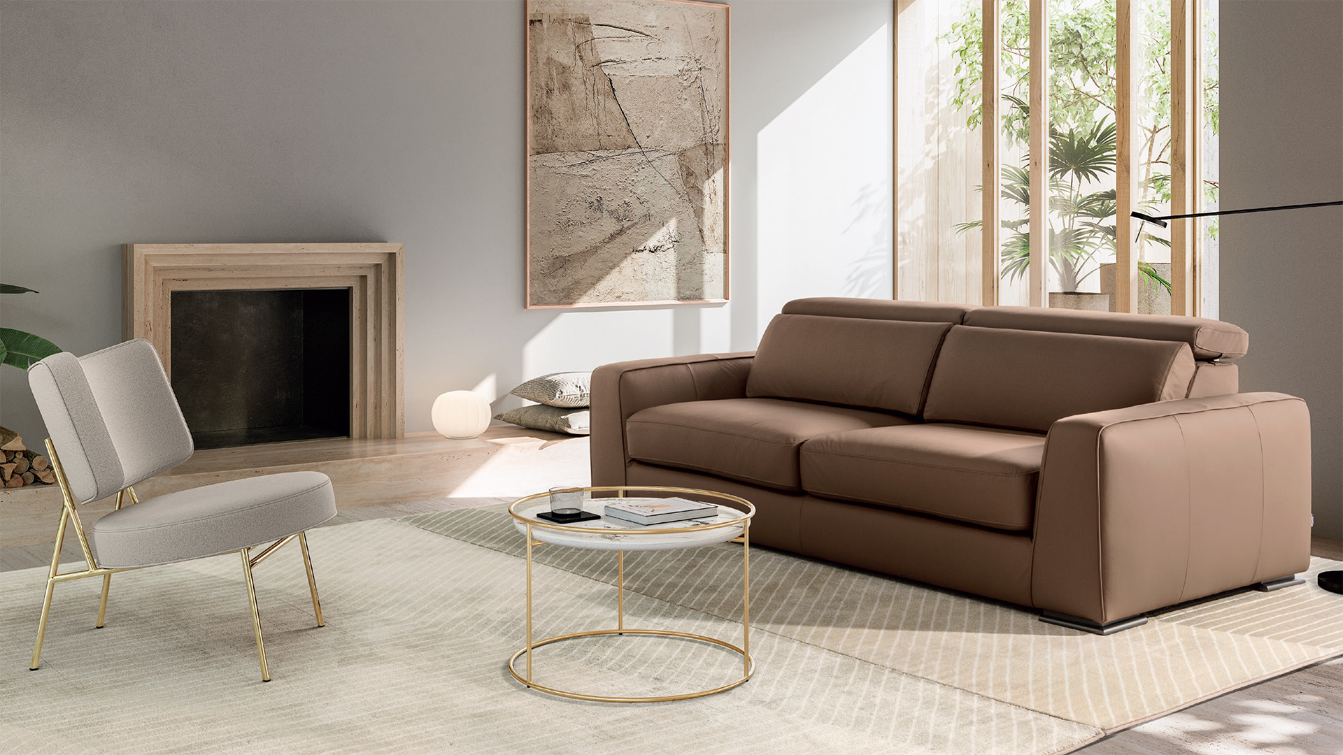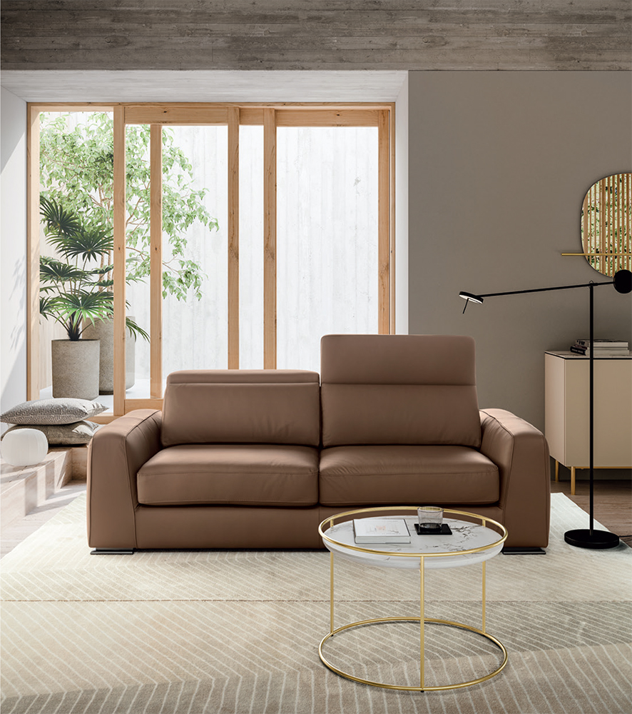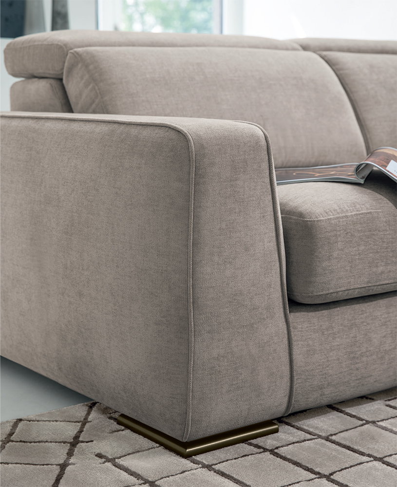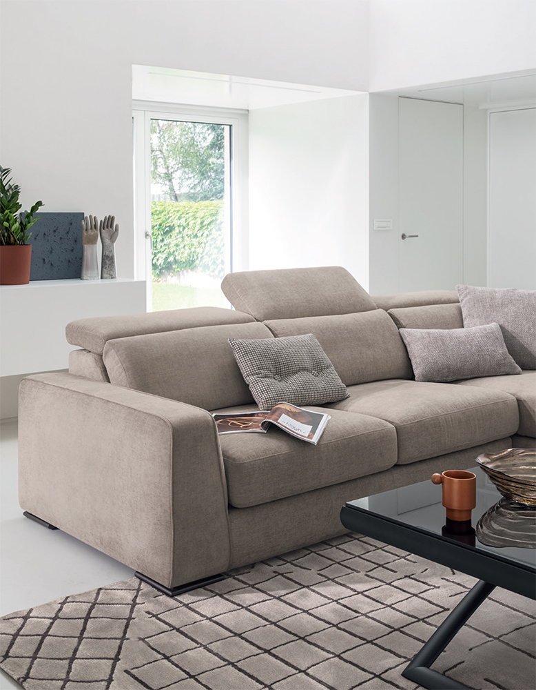 Simple and embracing lines for Cast, a sofa with pull-out seat, snap positioning movement and lateral chaise longue.
