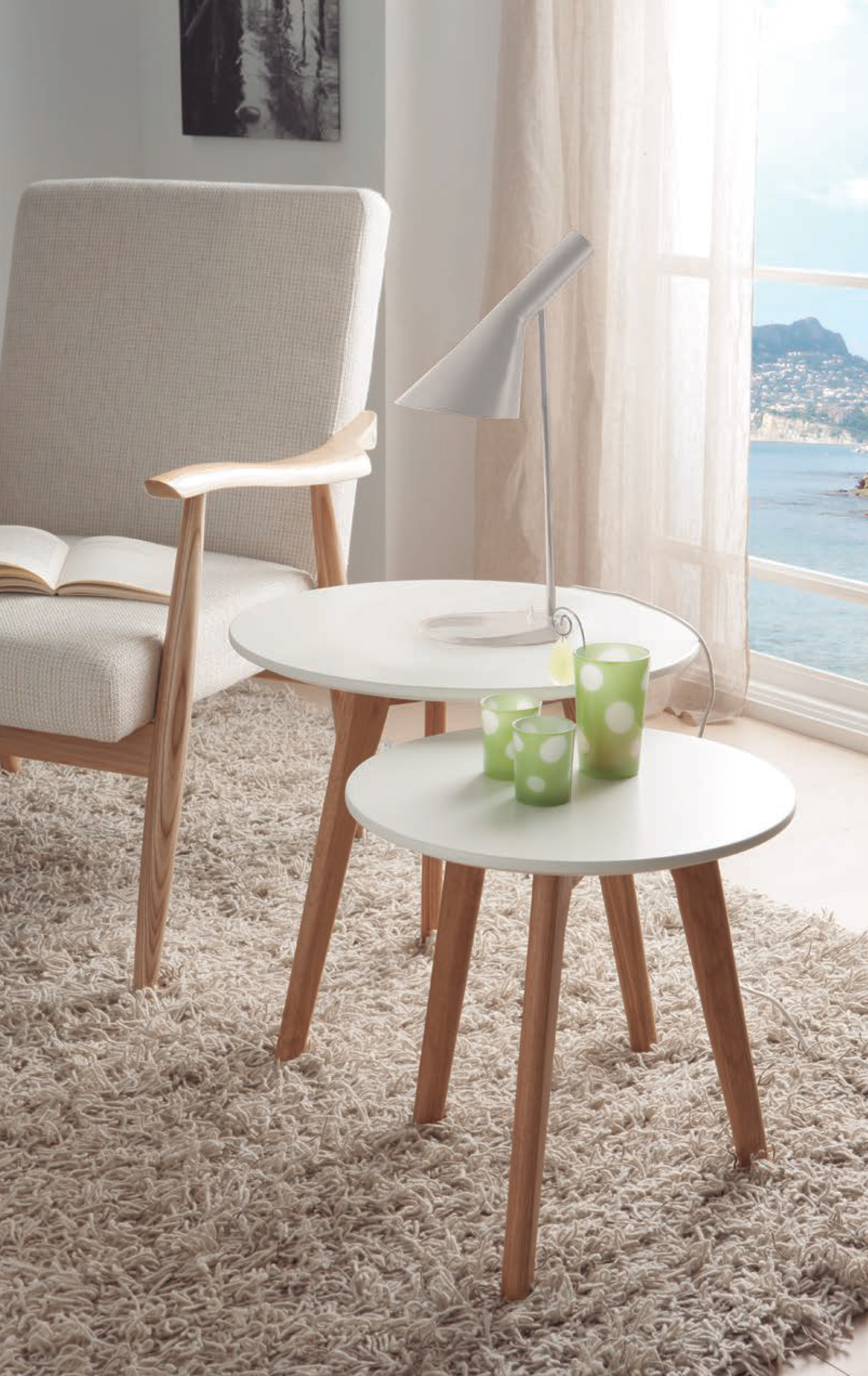 White coffee table. Set of two tables with natural oak legs.