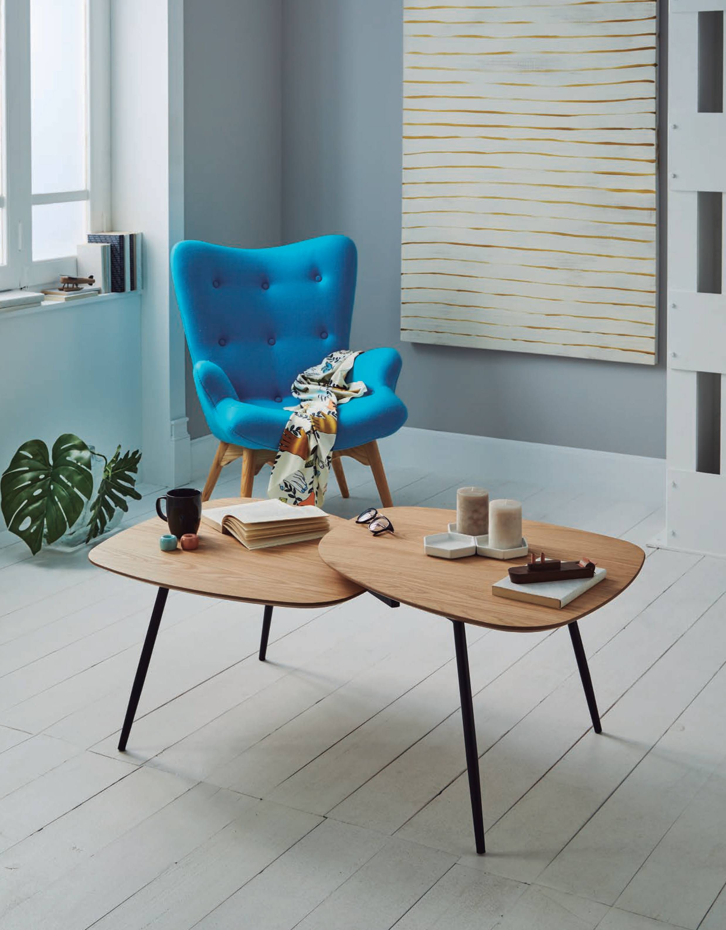 An original coffee table that creates the image of two connected tables. The tabletop is made of MDF and covered with oak veneer. The base and legs are made of metal.