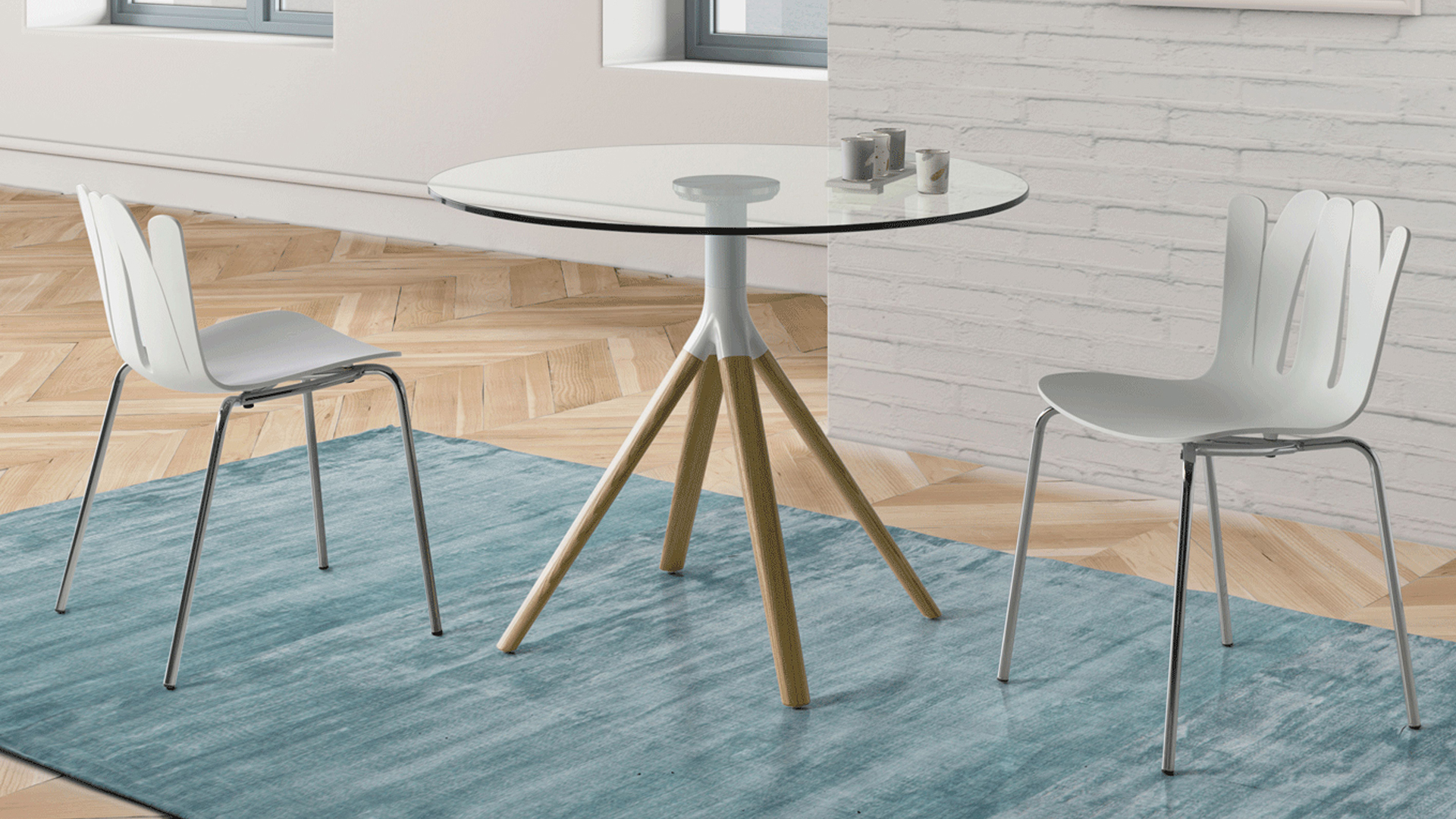 Designer Round Dining Table with 12 mm tempered glass top, metal frame and solid ashwood legs.