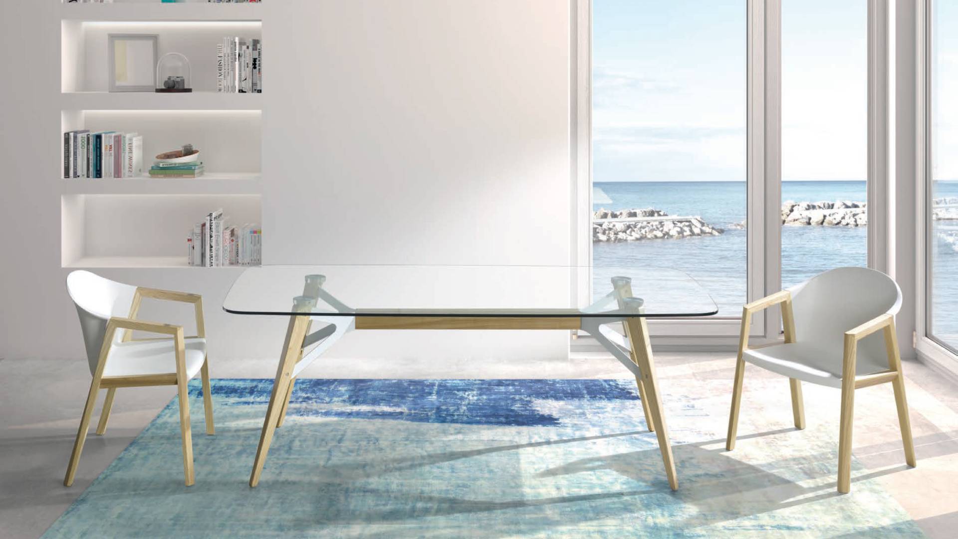 Designer Dining Table with 12 mm tempered glass top, metal frame and solid ashwood legs.