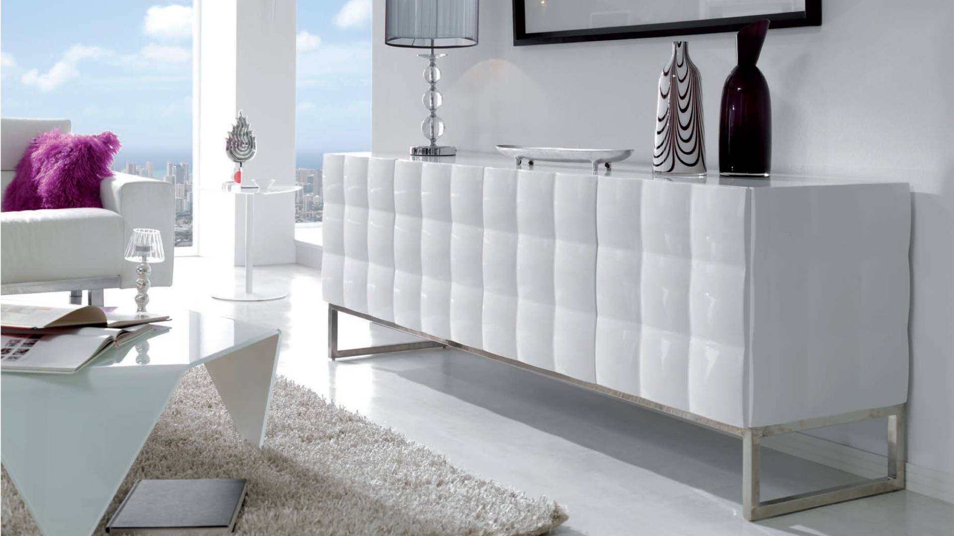 Wooden horizontal sideboard with a unique 3D design. Covered with high gloss lacquer and has 4 doors equipped with a system of opening to open doors.