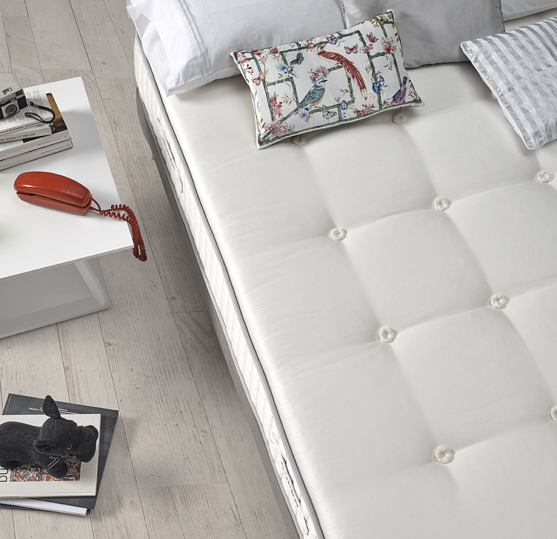 The springs provide a great firmness and adaptability that together with the softness of virgin wool and cotton create a sense of comfort and well-being. The pocket springs and natural fibers are held in place through the mattress with our exclusive pom-poms tufts made of soft cotton. The mattress has four handles embroidered for easy turning.