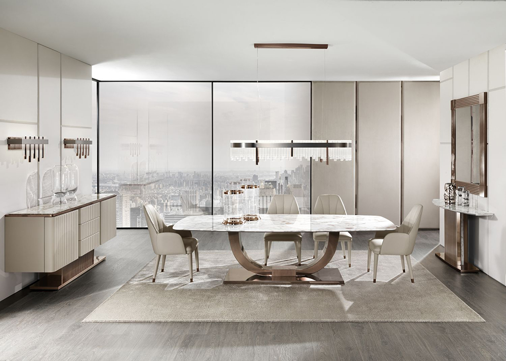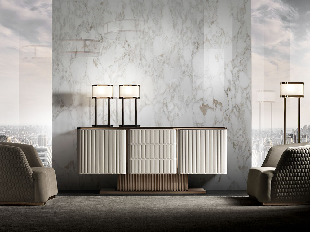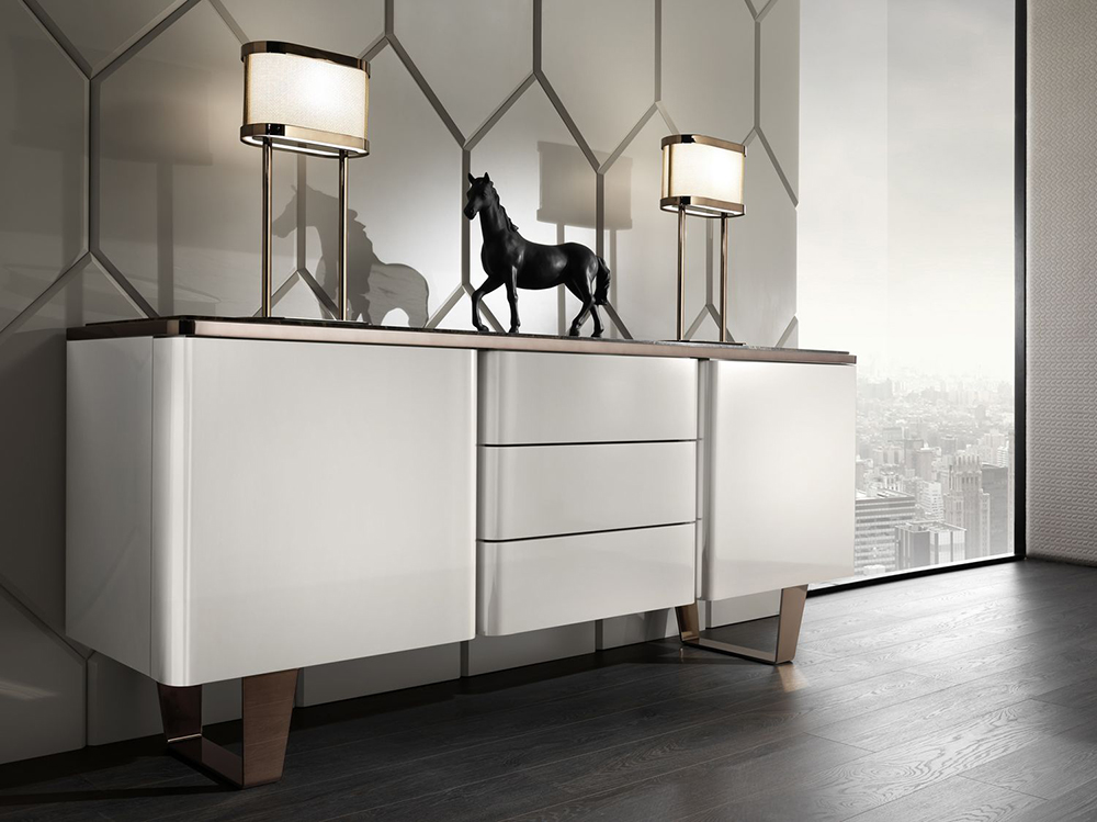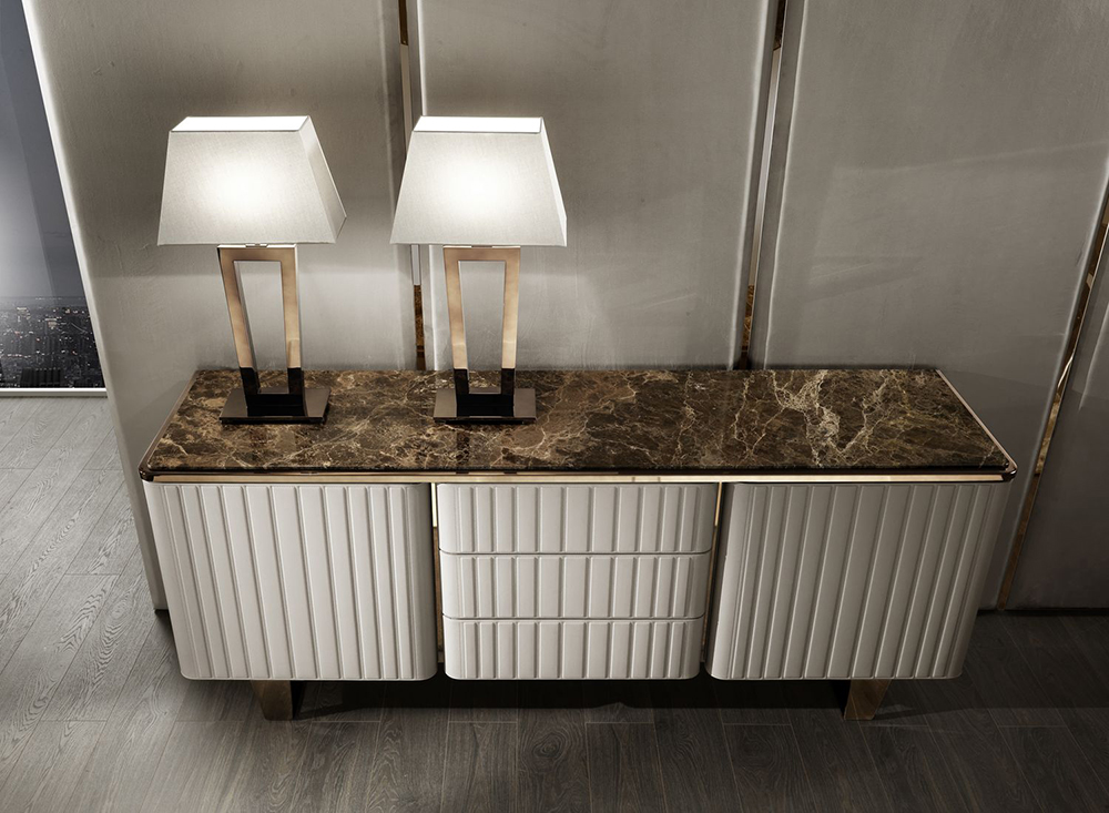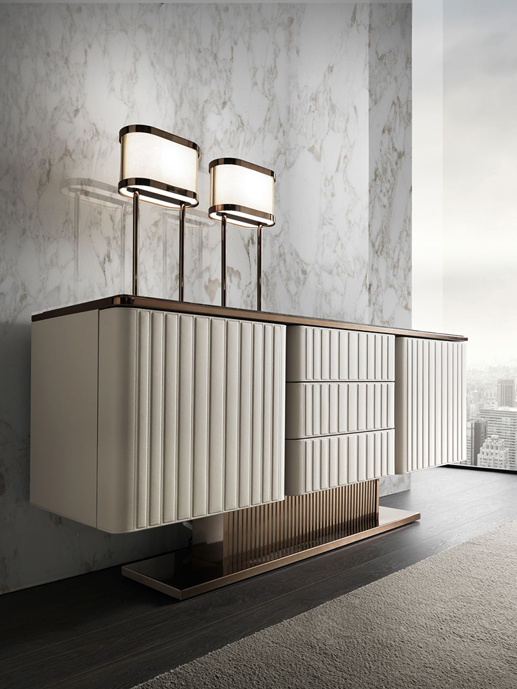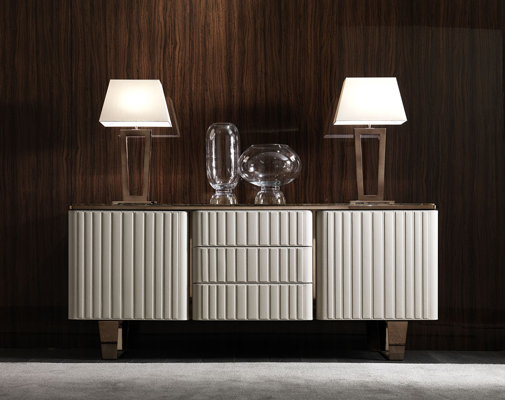Buffet with three drawers Elite is made in Art Deco style. The body of the furniture is upholstered in natural leather with a quilted surface. The relief is formed by even rectangles, which are formed by an even machine stitch. Two hinged doors provide access to a spacious storage compartment. All drawers have a silent closing and opening system.