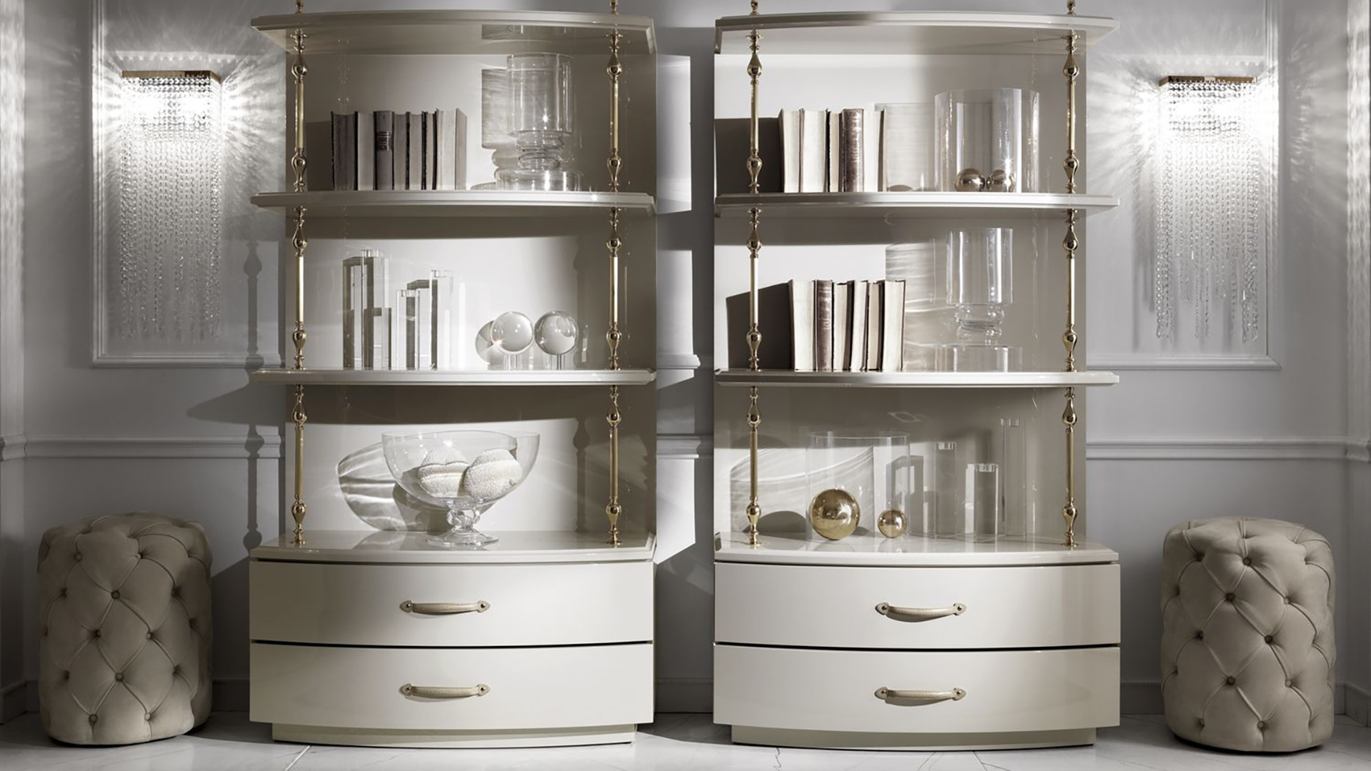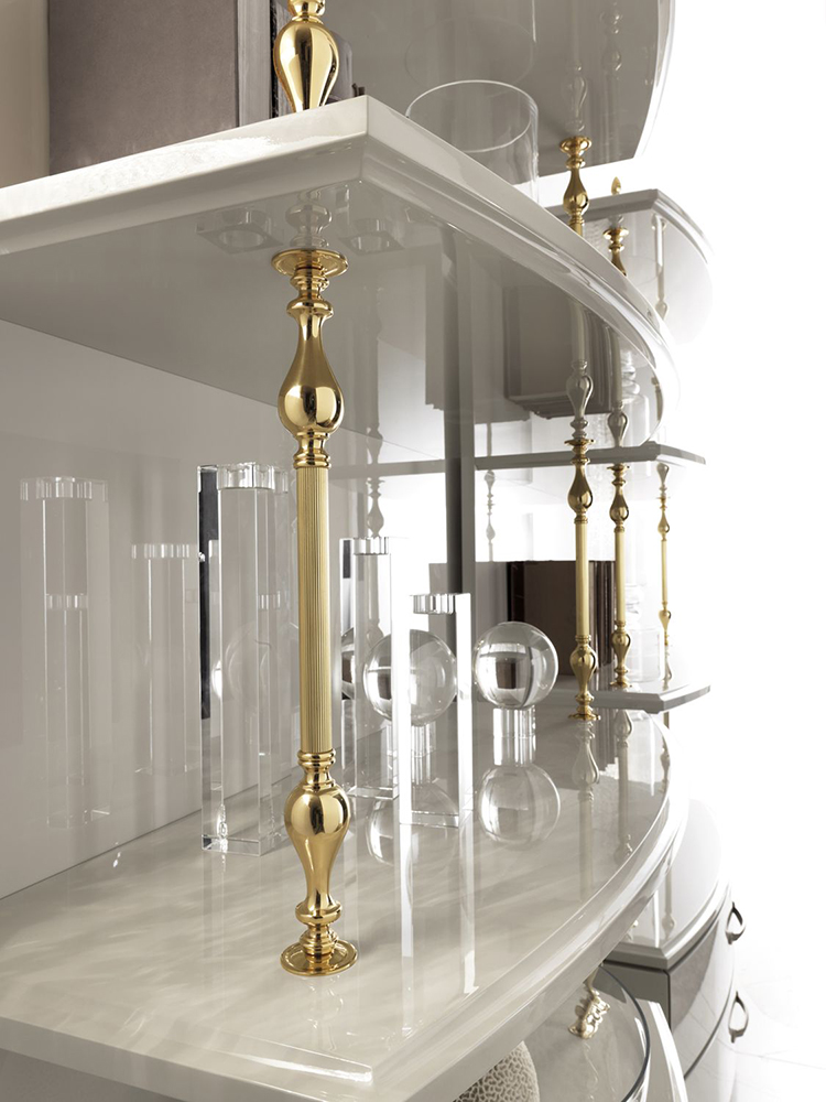 Shelving unit with three open shelves and two drawers. Decorated with figured metal columns. Other finishes are possible.