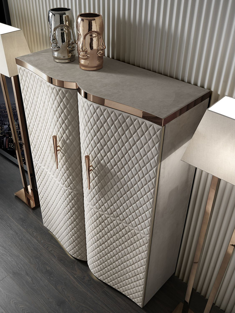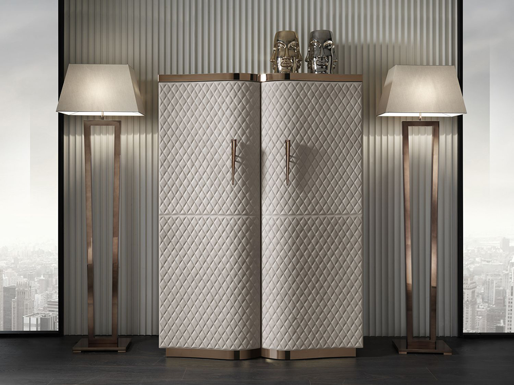 Bar cabinet with two figured hinged doors in leather upholstery. The base is made of metal. Equipped with lighting, two glass shelves, mirrors and two drawers. Other finishes and upholstery options are available. Also, you can additionally convert the cabinet: install a refrigerator, holders for glasses and compartments for storing drinks.