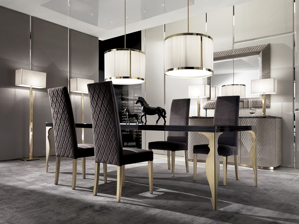 Dining table with rectangular wooden top and shaped metal legs. Other finishes are possible.
