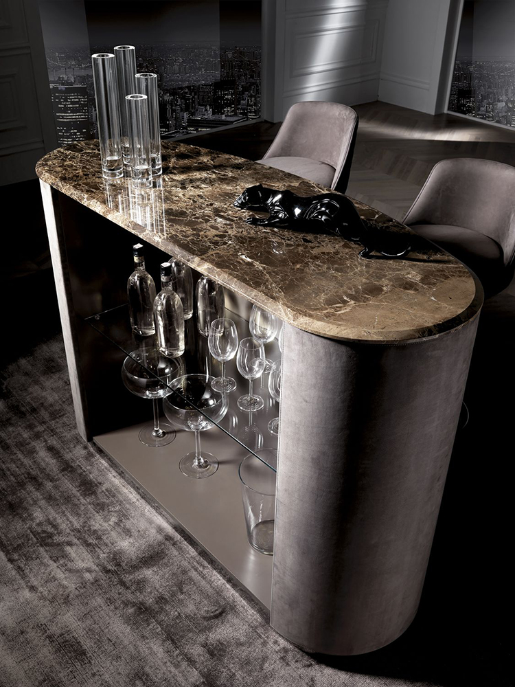 Vogue designer bar. The body of the model, slightly curved, is made of MDF panels on a solid metal base. Outside, it is covered with soft nubuck or leather. The tabletop is made of luxurious marble, presented in several textures. The internal design of the bar includes three shelves and two drawers hidden by doors. The facade of the product is decorated with quilted stitching. Non-standard, but at the same time sophisticated bar for a modern interior.
