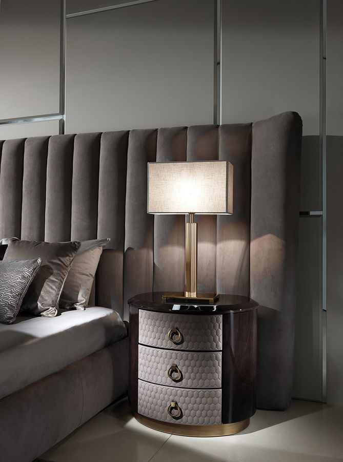 Bed with upholstered headboard Hermes Maxi - the right choice for comfortable sleep and relaxation. The wide back is covered with a soft base and decorated with vertical machine stitches that form an original relief. The soft frame is also designed to match the headboard. Silver-plated metal legs complete the design of the furniture. An art deco style bed will fit into the interior of a modern bedroom.