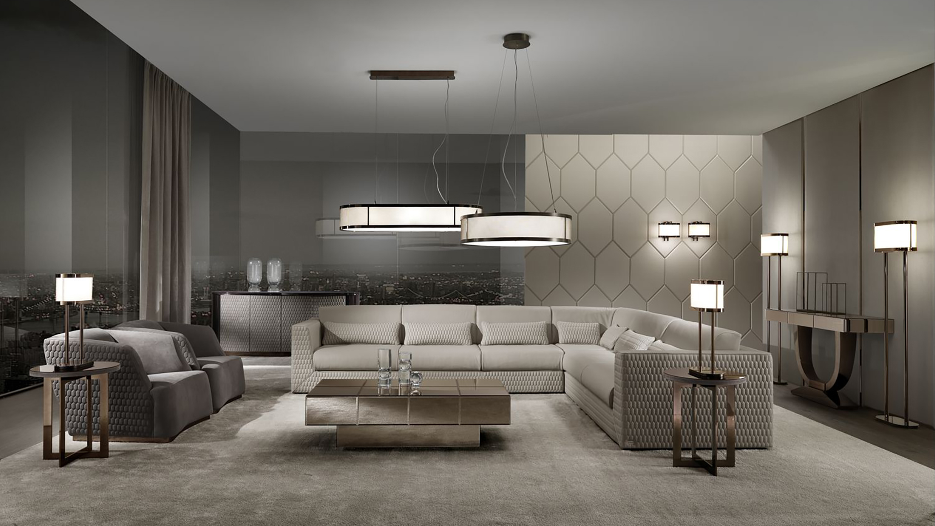 The Venice armchair embodies true comfort and echoes of Venetian design. It has voluminous forms and decorative outer stitching of the side elements. Instead of legs, the chair has a flat solid base.