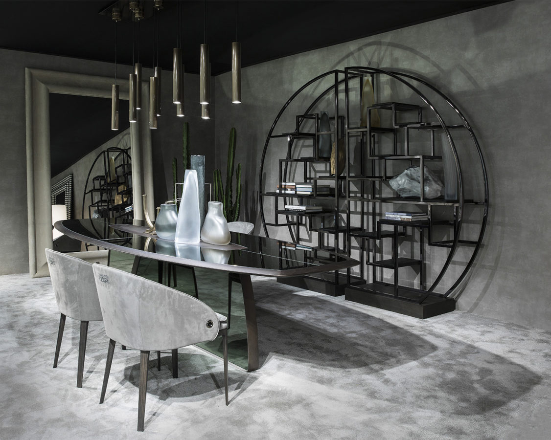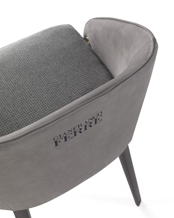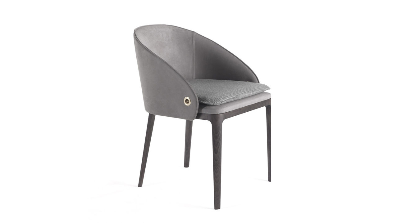 An elegant silhouette and clean lines for the new Rio chair. The contrast between the slim structure of the legs in Smokey Grey finishing and the enveloping shape of the seat upholstered with fabrics of the collection makes the chair original and appealing. The peculiarity of the lateral handles lends an original touch to this sophisticated and super chic piece of furniture.