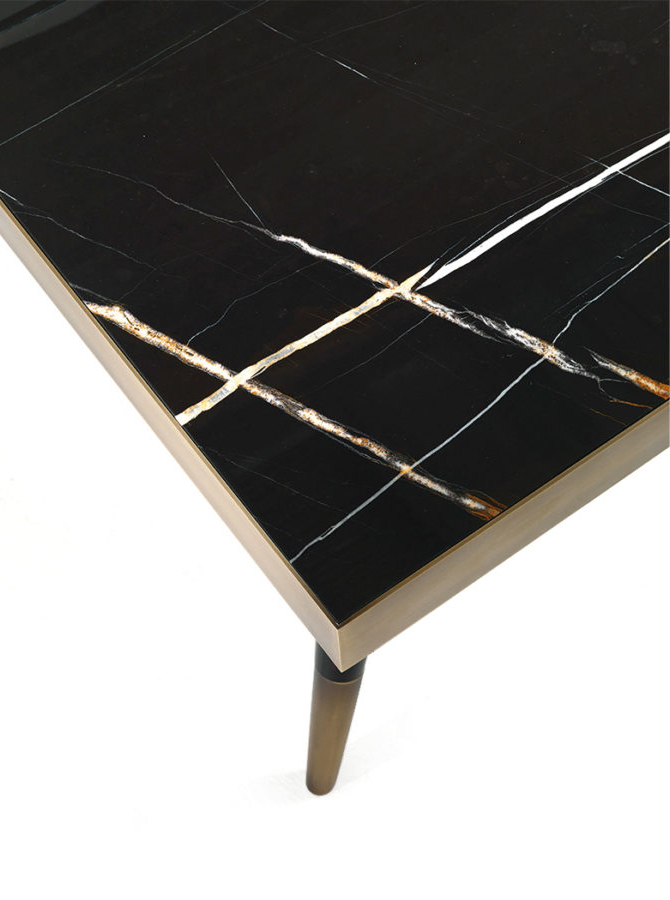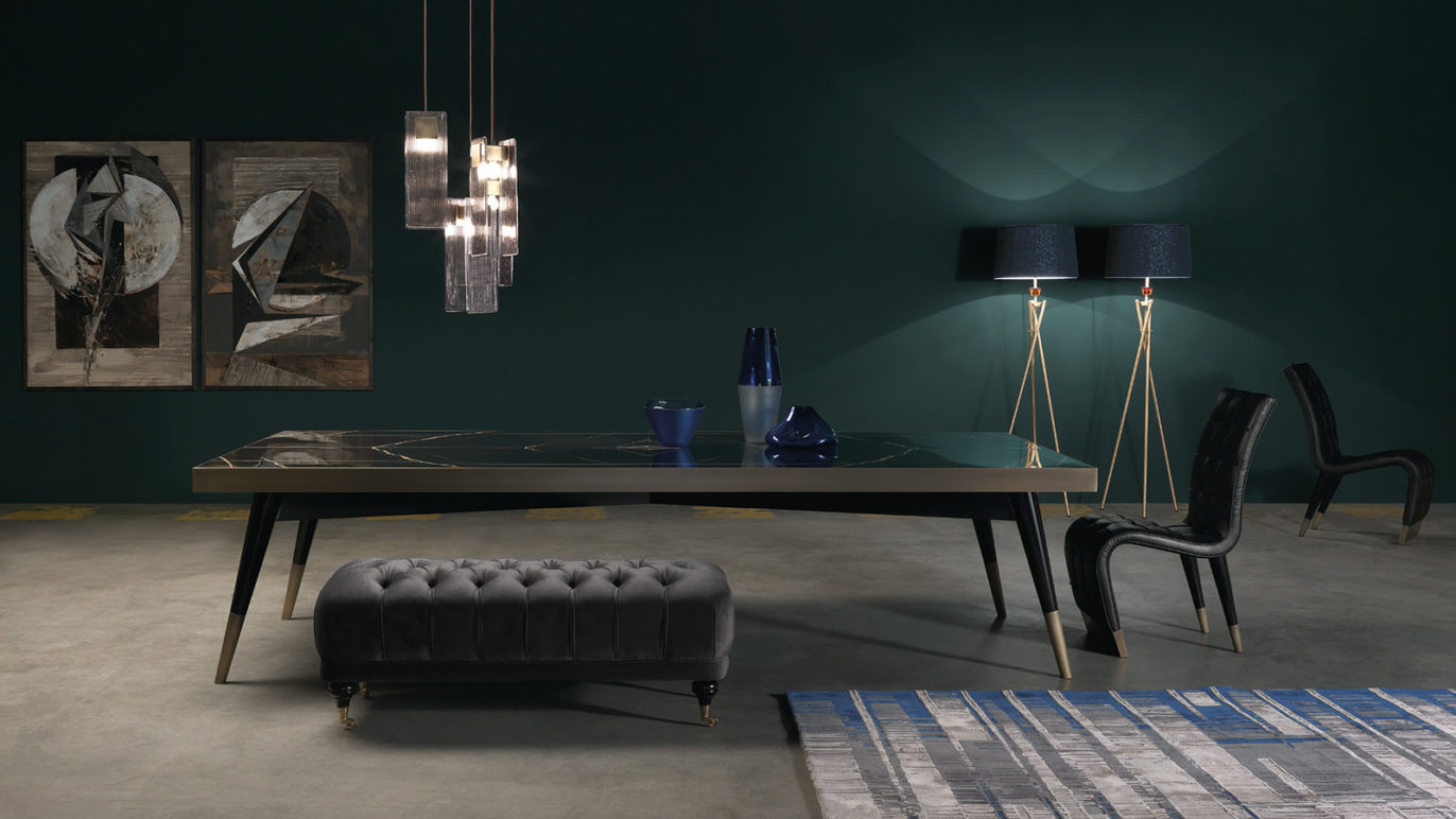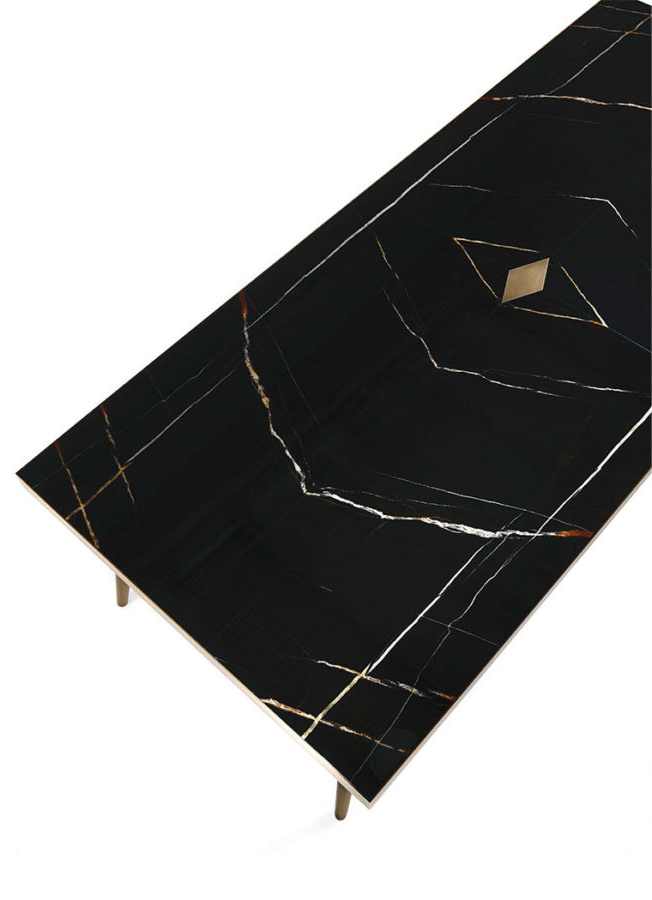 A new version of the Mayfair dining table, presented this year with a rectangular shape. The top in precious Sahara Noir marble presents a central brass rhombus from which the subdivision of the mirrored marbles originates. The slim legs, with a black lacquered finish and bronzed brass details, recall the 1950s and give the table a sense of elegance and lightness.