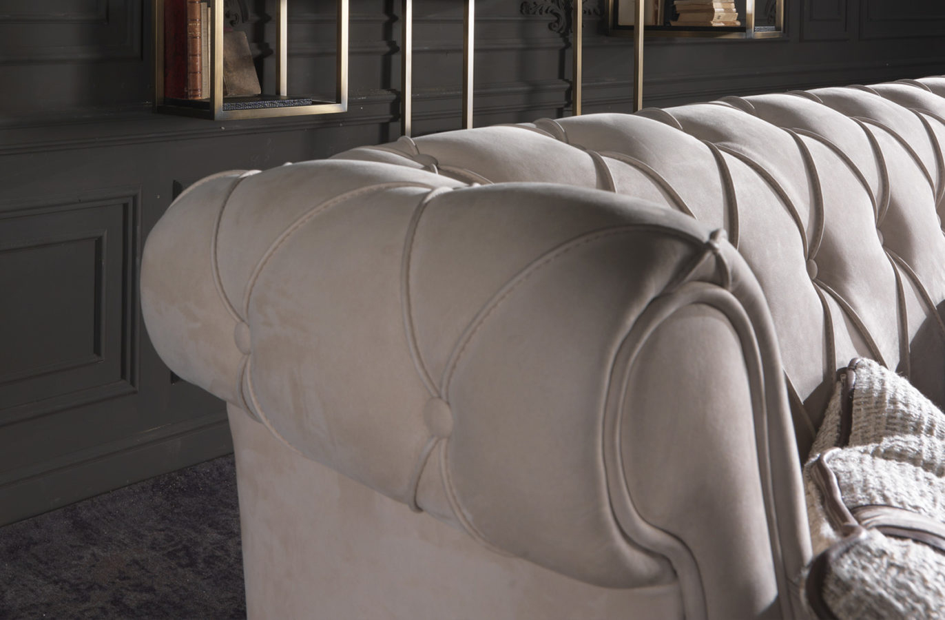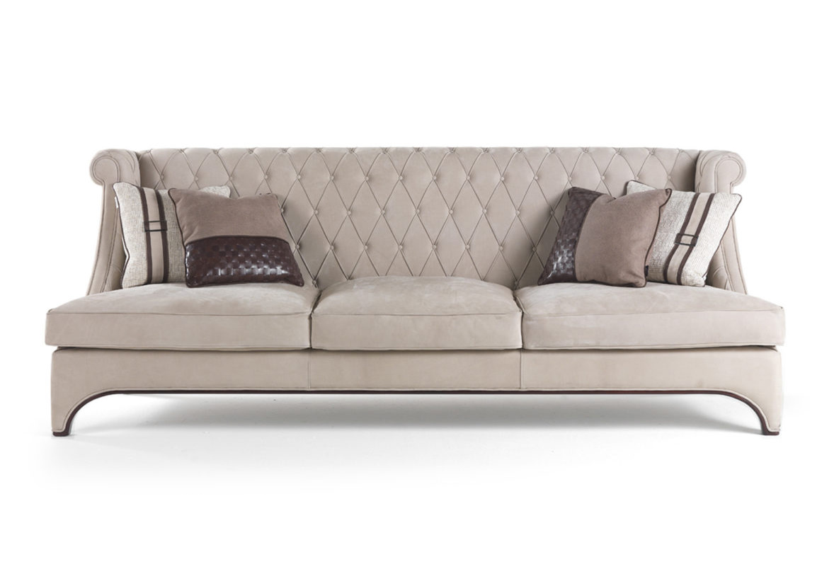 With its harmonious seatback, Bradmore sofa is characterized by a refined manufacturing with a thin border which stands out the rhombus pattern, in contrast to the homogeneity of the wide and comfortable sitting cushions. An accurate sartorial manufacturing framed by an elegant mahogany insert at the base.