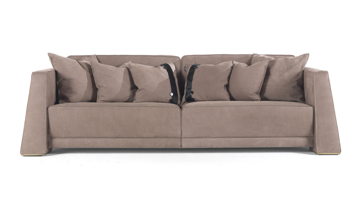 A modern sofa with sober and rigorous lines, which contrast with the feeling of softness and comfort given by the leather upholstery. The bold details expressed in the refinement of the leather workmanship, with a characteristic raw-thread stitching that gives an unfinished look to the whole, make the Kilt sofa a versatile and original piece of furniture, able to lend a refined and at the same time welcoming look to every environment.