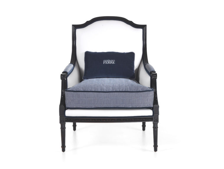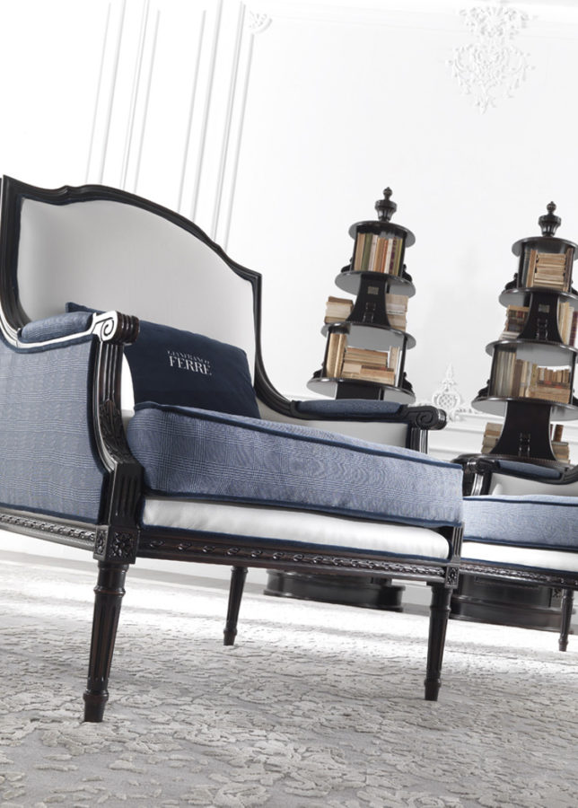 An original game of contrasts between materials, styles and colors. The Sweet Armchair combines Louis XV structure and armrests, a white fabric upholstery and blue Prince of Wales cushions. A strong visual impact with a sophisticated allure combining different references and inspirations in perfect Gianfranco Ferré style.