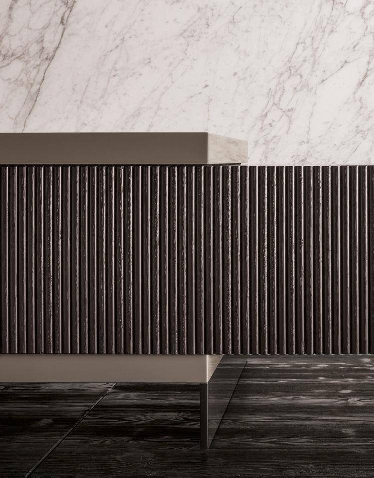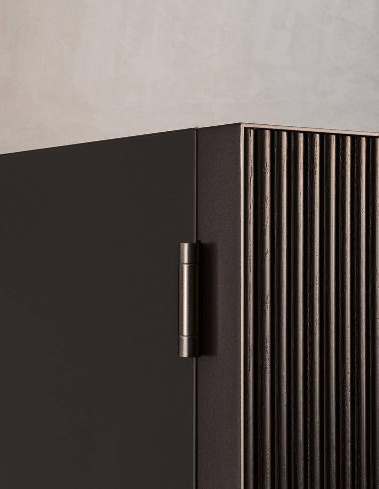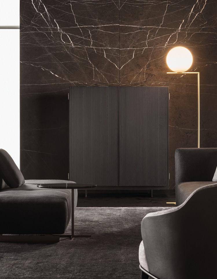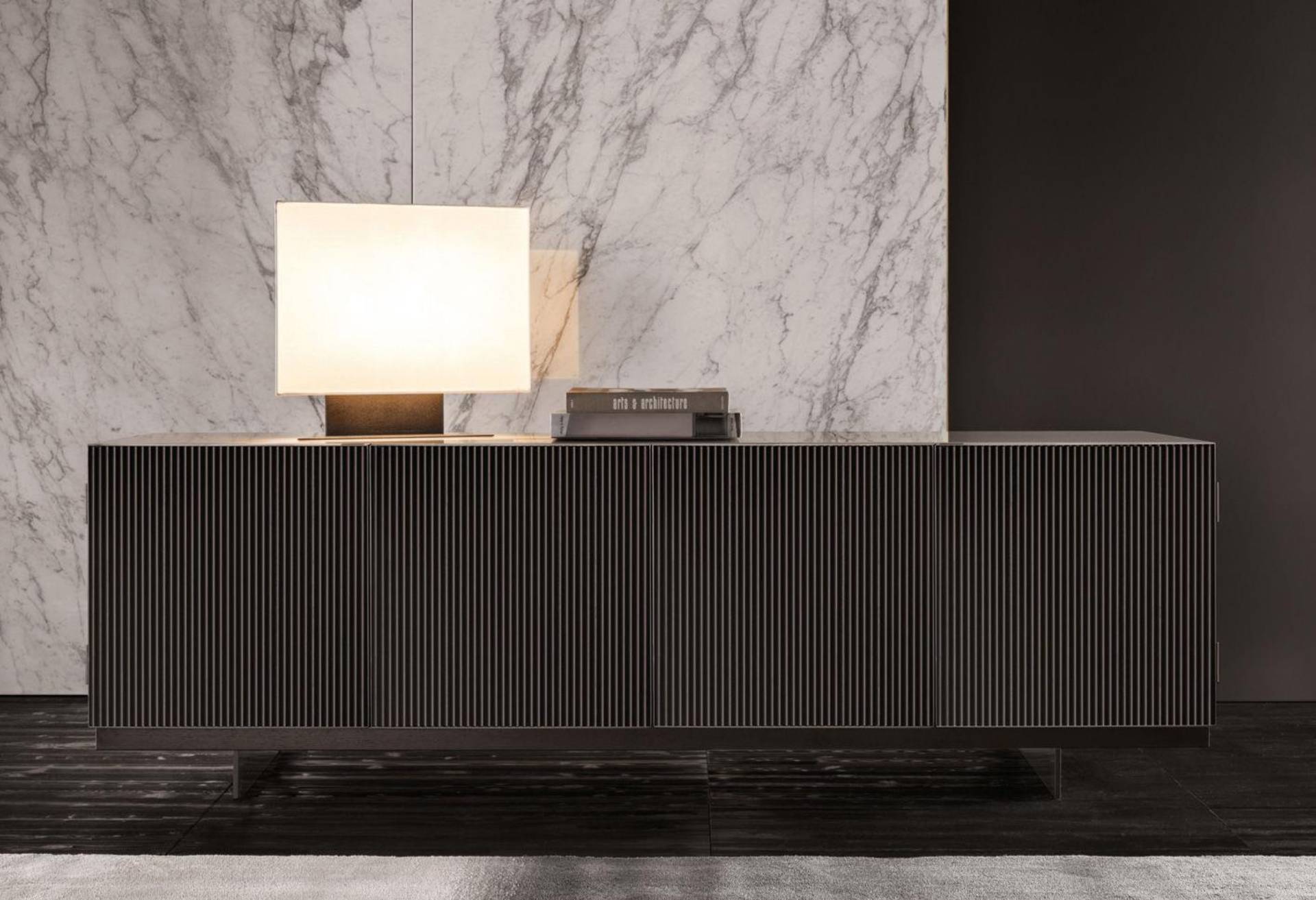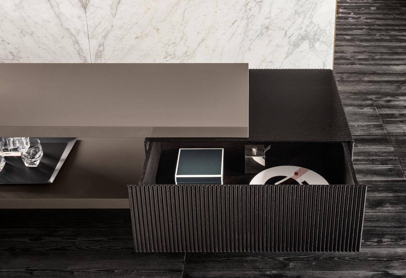 The sophisticated workmanship that distinguishes the Aylon family of cabinets traces back to the heritage of cabinet-making typical of Italy’s Brianza area. The sleek shapes combine with a taste for refined details, like the unusual workmanship on the doors, created through the use of turned strips of solid oak, with open pore Moka color lacquer finish, set into an elegant metal frame with a matt Pewter color finish. The meticulous attention focused on each construction detail is also evident in the hinges, crafted from an exclusive Minotti Studio design. The hinges can be adjusted for height, width and depth and allow the doors to open 190 degrees. The structure comes in glossy lacquer Sand, Clay or Granite finish. The Aylon series includes two sideboards, a cupboard and a living-space unit featuring a clever play of shapes, with a lateral projecting storage element.
