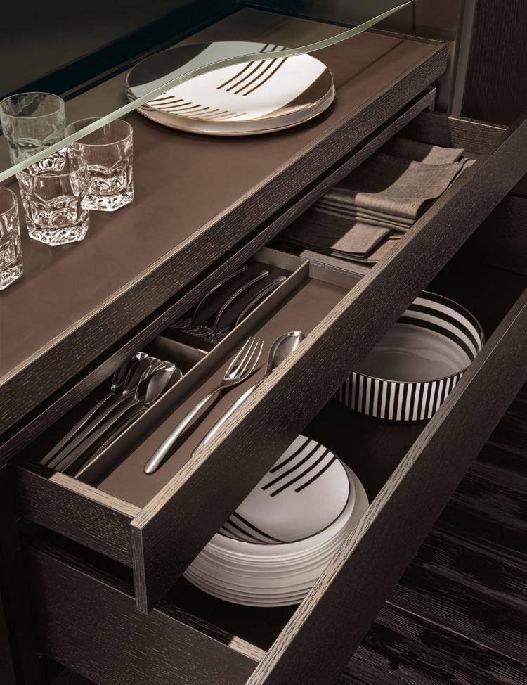 The interior fittings for each element were carefully designed to respect the function served by each piece. The cupboard was crafted for placement in the dining room and the luxurious interior fittings are exquisitely suited to this use – opening the door turns on the LED strip lights positioned in the upper shelf. The space is thoughtfully divided to accommodate a clear, beveled glass shelf for storing glasses and a pull-out shelf covered in saddle-hide, a cutlery drawer also covered in saddle-hide, and two generously-sized drawers designed to hold plates and other tableware items.
