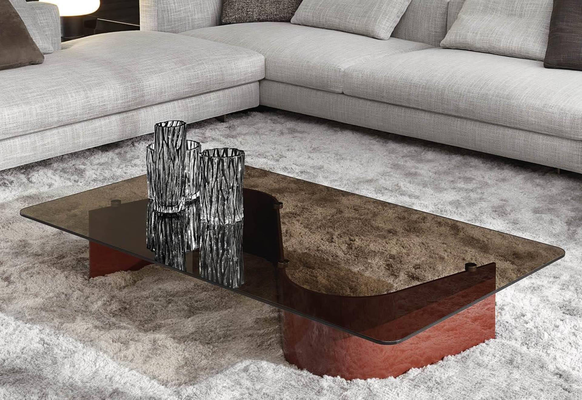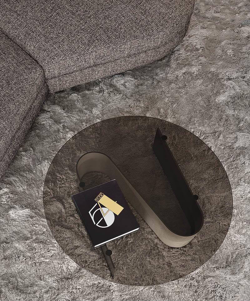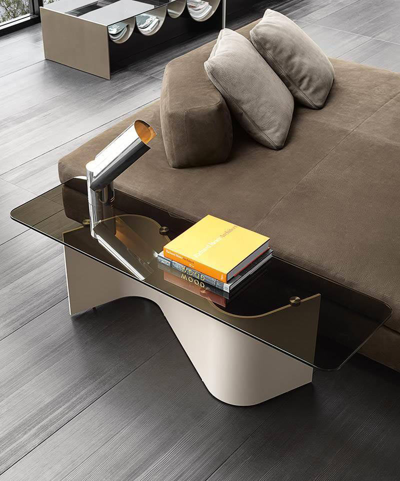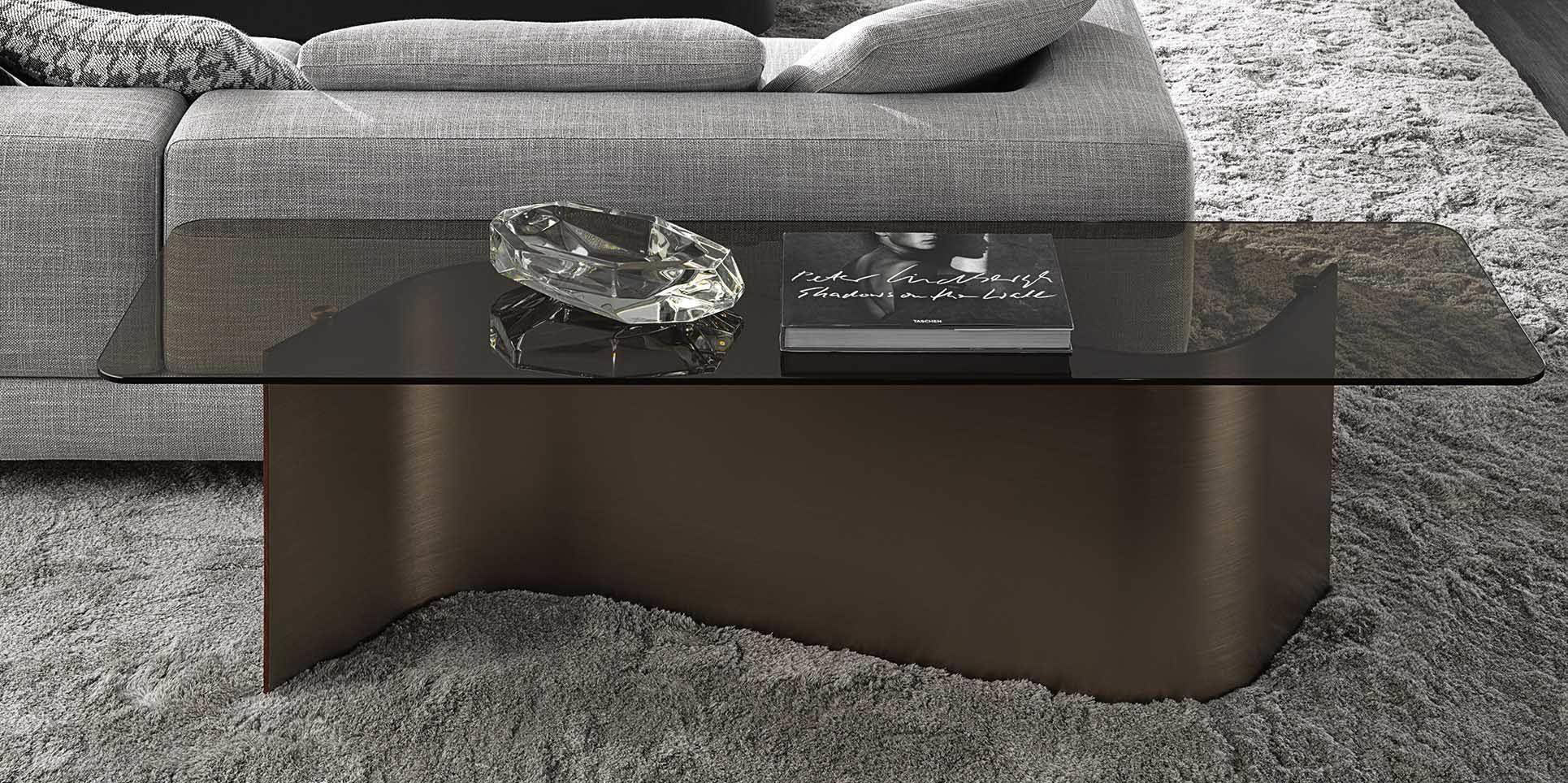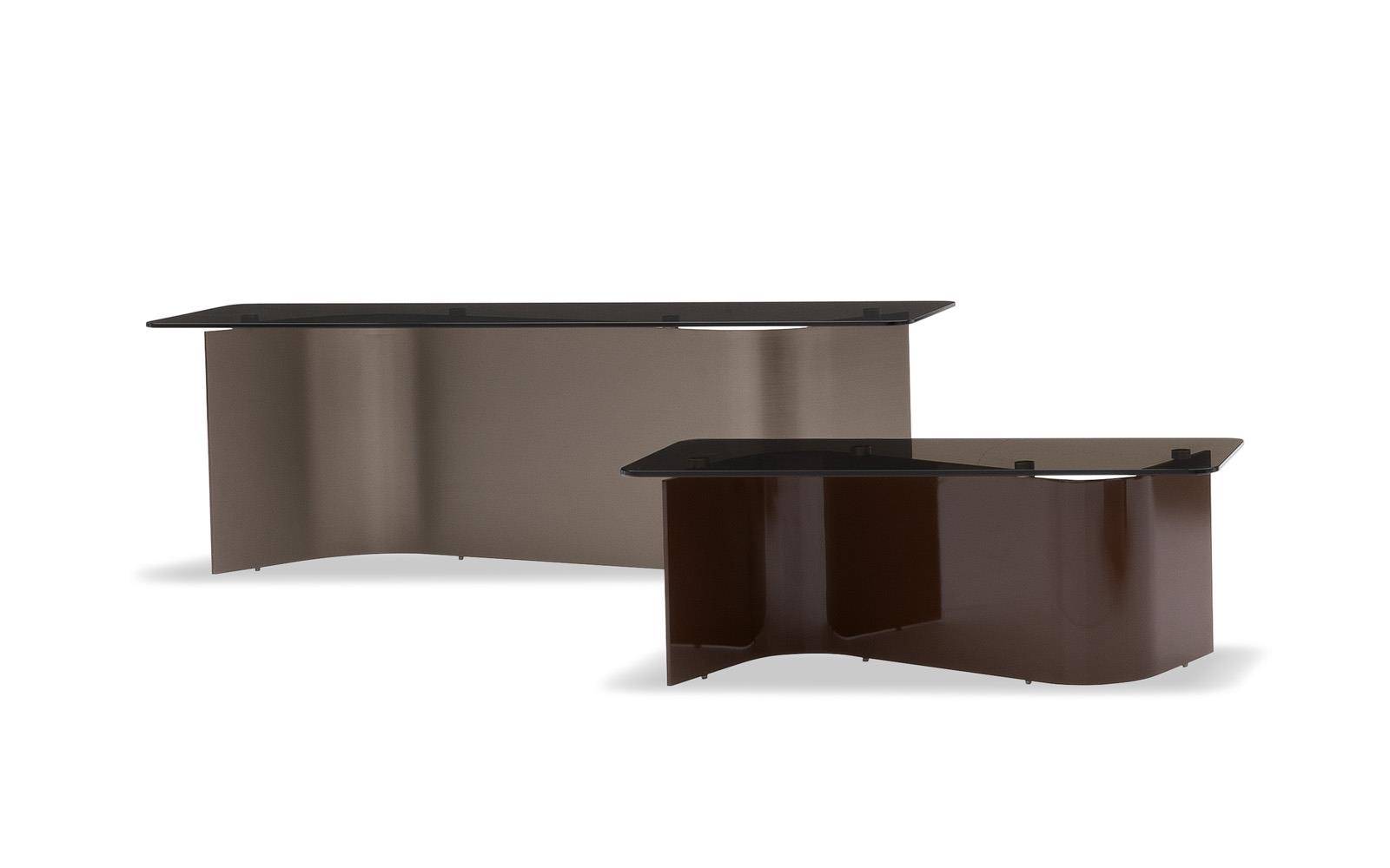 A sharp and decisive mark gives shape to the metal sheet of the base on top of which rests a bronzed glass surface. A double shade, glossy and opaque, defines the two surfaces of the supporting structure, which combines the satin Bronze painted metal with the Corten or Sand coloured glossy paint.