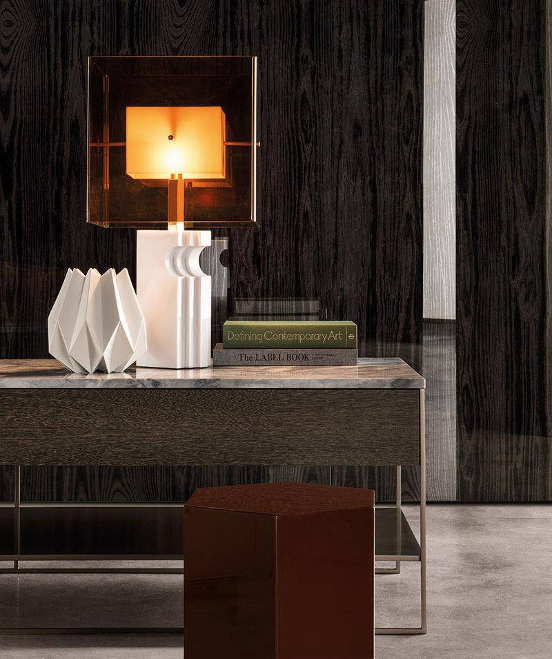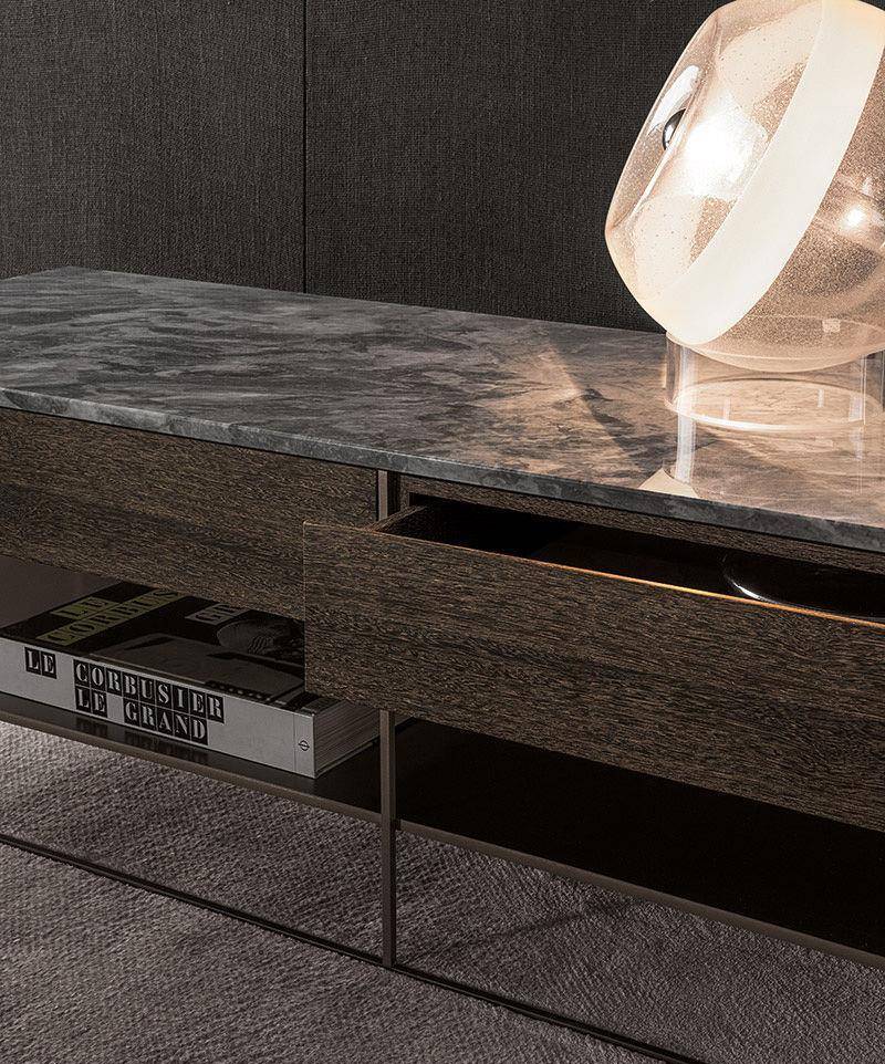 The slender iron structure now comes in a Bronze satin finish. Several new versions of the top are also available: glossy lacquered Sand, Sucupira veneer stained Mink color, and Bardiglio Nuvolato or Calacatta marble. The under shelf is also in satin finish metal painted Bronze. Some of the consoles are equipped with drawers in Sucupira stained Mink color.
