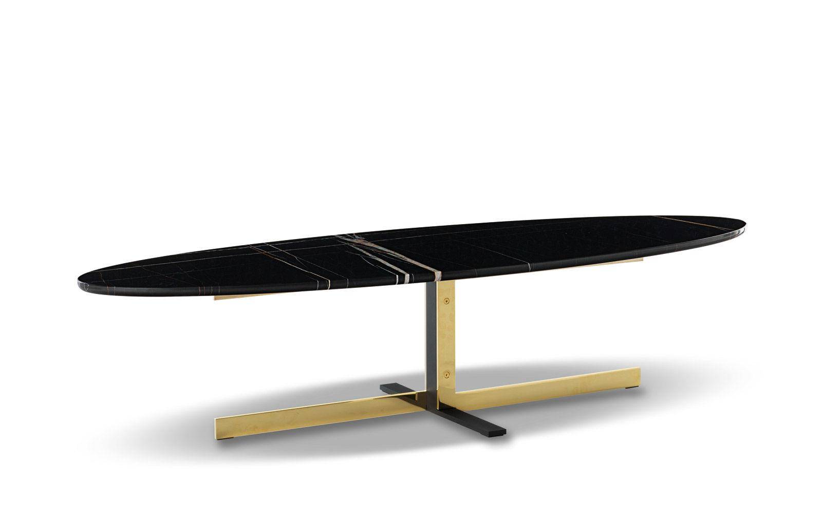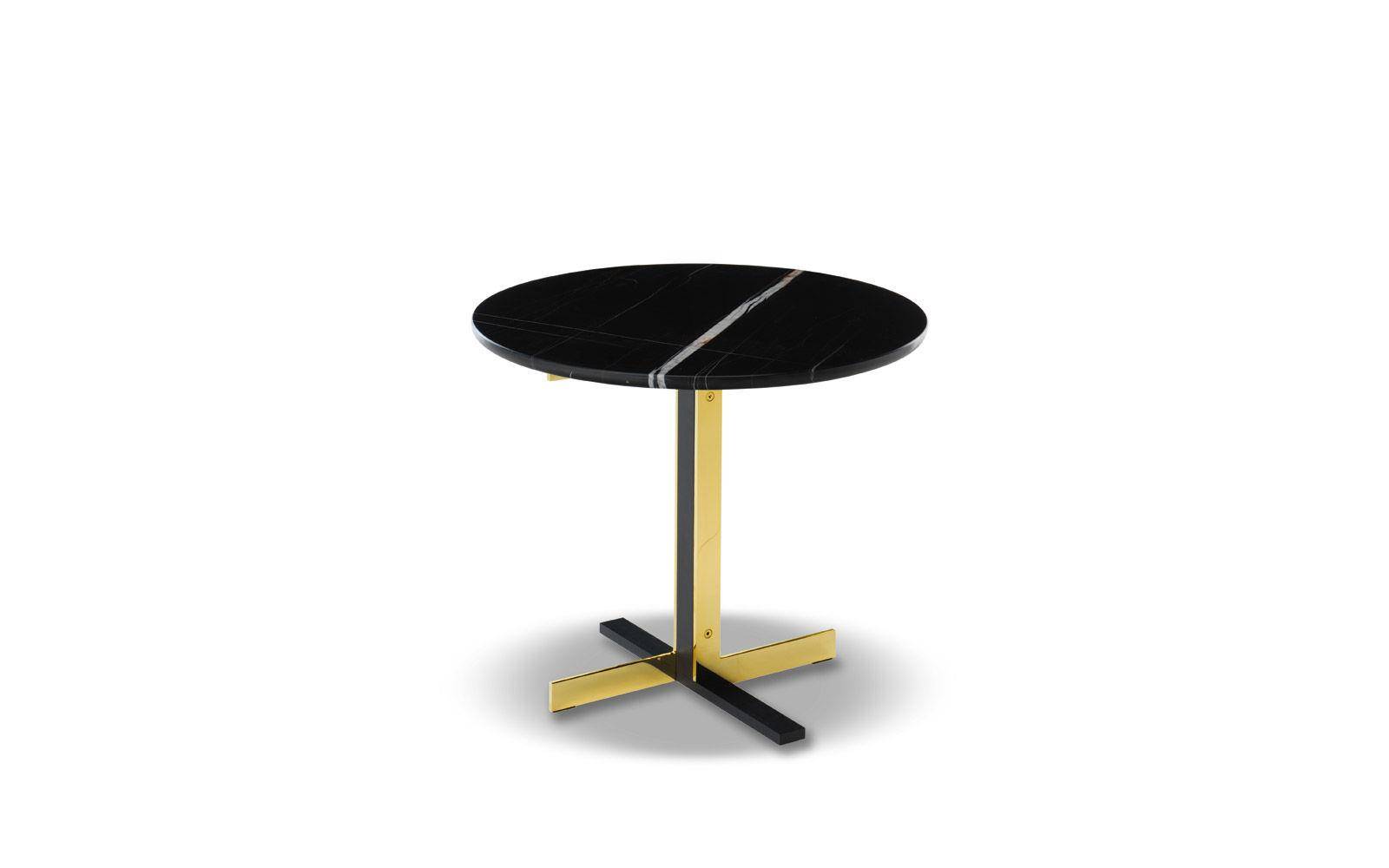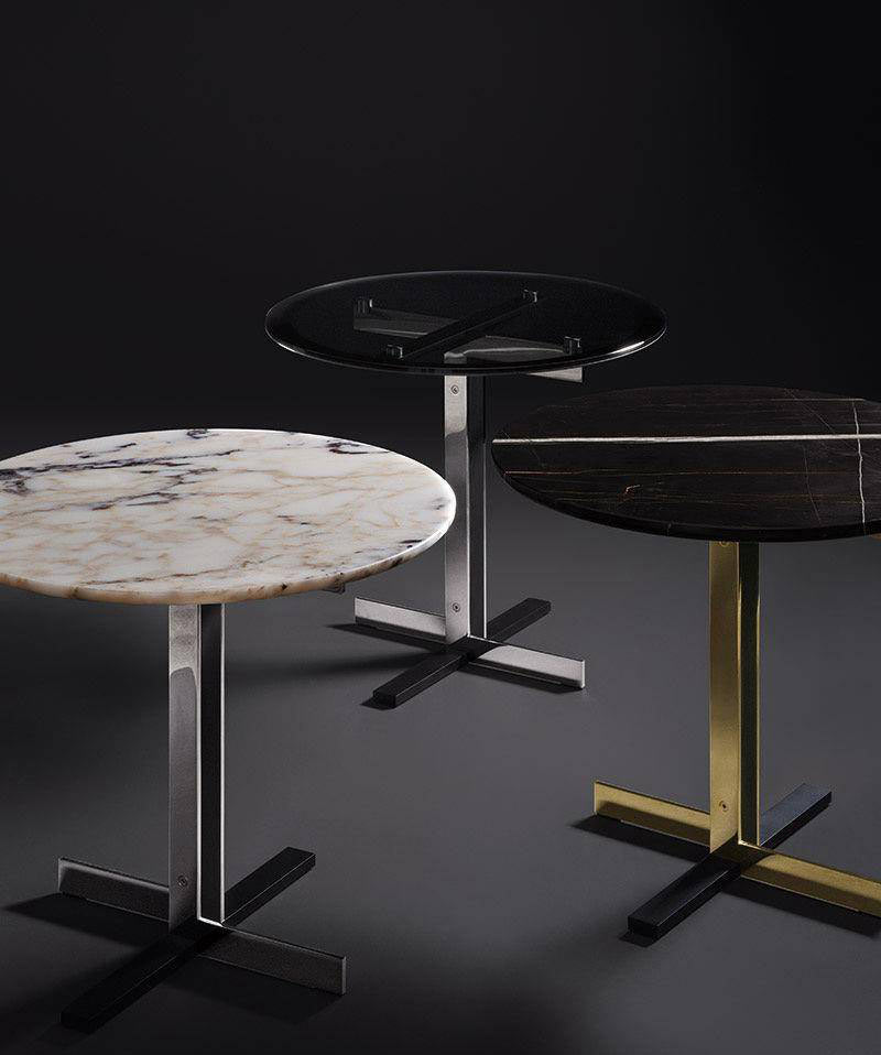 The Catlin collection of coffee tables conveys an air of sophisticated simplicity, available in an array of materials that express refined, restrained elegance. If the Catlin coffee table is simple by design, the choice of materials offers exciting combinations for creating bold visual and tactile effects. The elegant metal base features a cross-pattern motif and invites some unique combinations: textured black-painted paired with bright Chrome or Gold finish, for very different stylistic interpretations. The suggested combinations of materials for innovative elegance continues with the table top options, available in laminated Smoked Grey glass or in two rare and luxurious marbles like Arabescato Purple or Sahara Noir, with polished finish. The Catlin series includes coffee tables with round and oval tops, available in various sizes, as well as a console table version and dining tables.