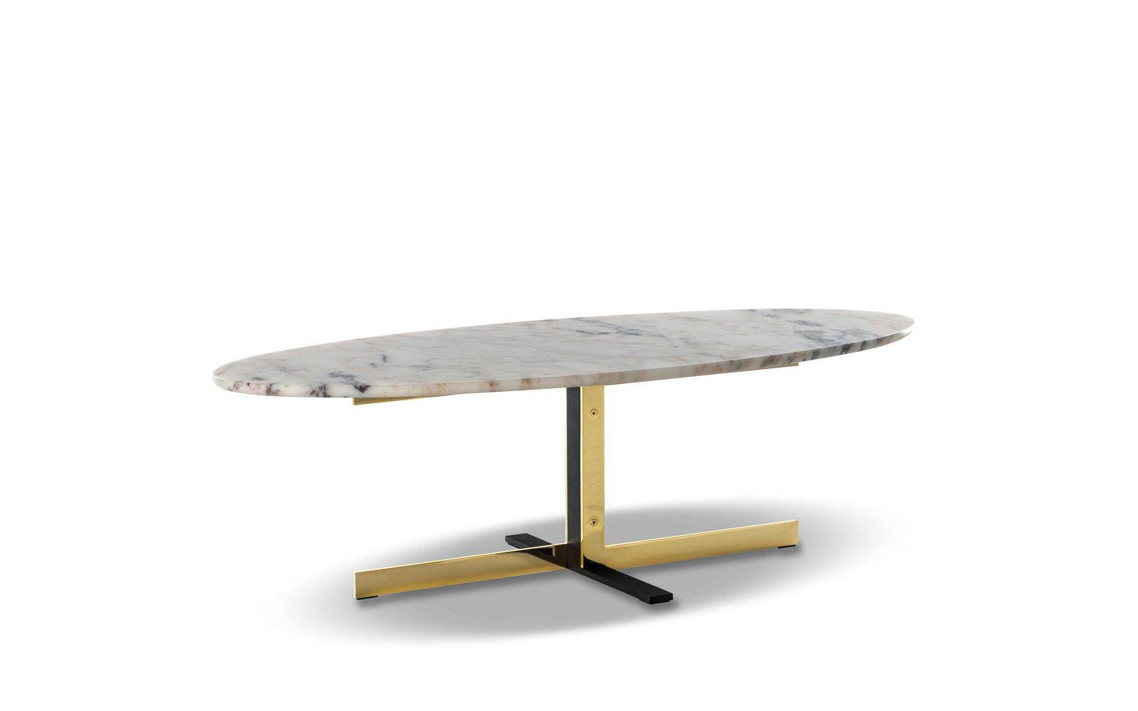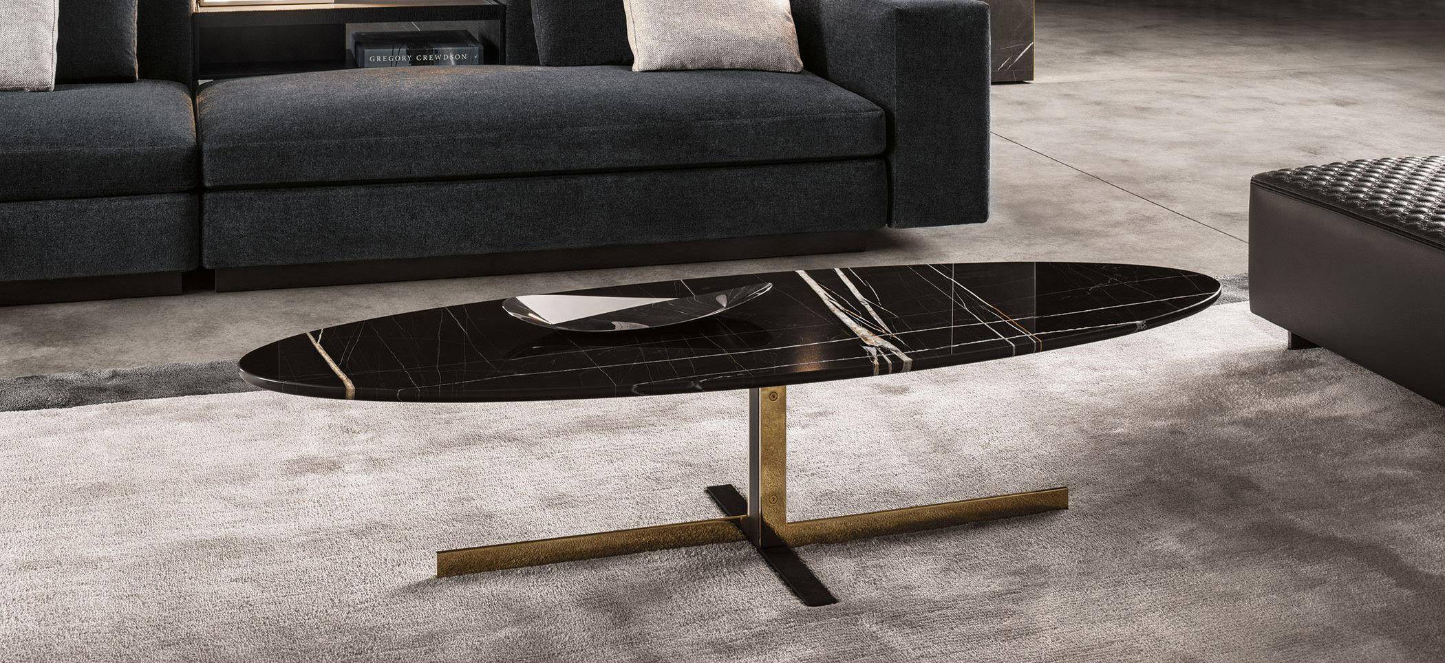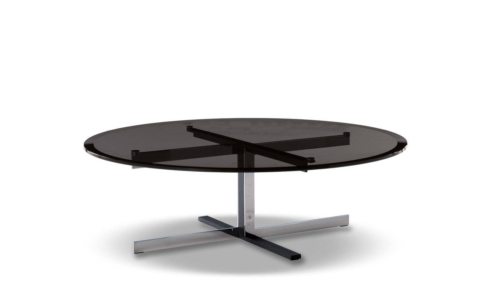 The Catlin collection of coffee tables conveys an air of sophisticated simplicity, available in an array of materials that express refined, restrained elegance. If the Catlin coffee table is simple by design, the choice of materials offers exciting combinations for creating bold visual and tactile effects. The elegant metal base features a cross-pattern motif and invites some unique combinations: textured black-painted paired with bright Chrome or Gold finish, for very different stylistic interpretations. The suggested combinations of materials for innovative elegance continues with the table top options, available in laminated Smoked Grey glass or in two rare and luxurious marbles like Arabescato Purple or Sahara Noir, with polished finish. The Catlin series includes coffee tables with round and oval tops, available in various sizes, as well as a console table version and dining tables.