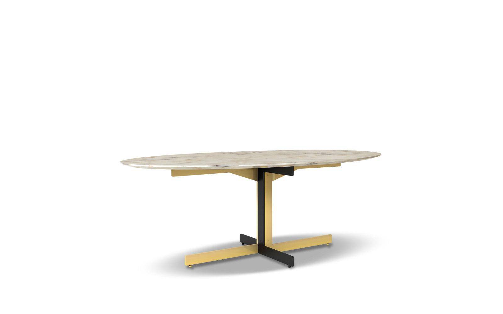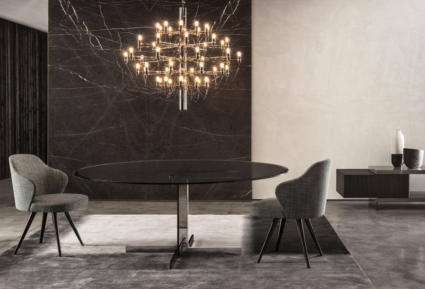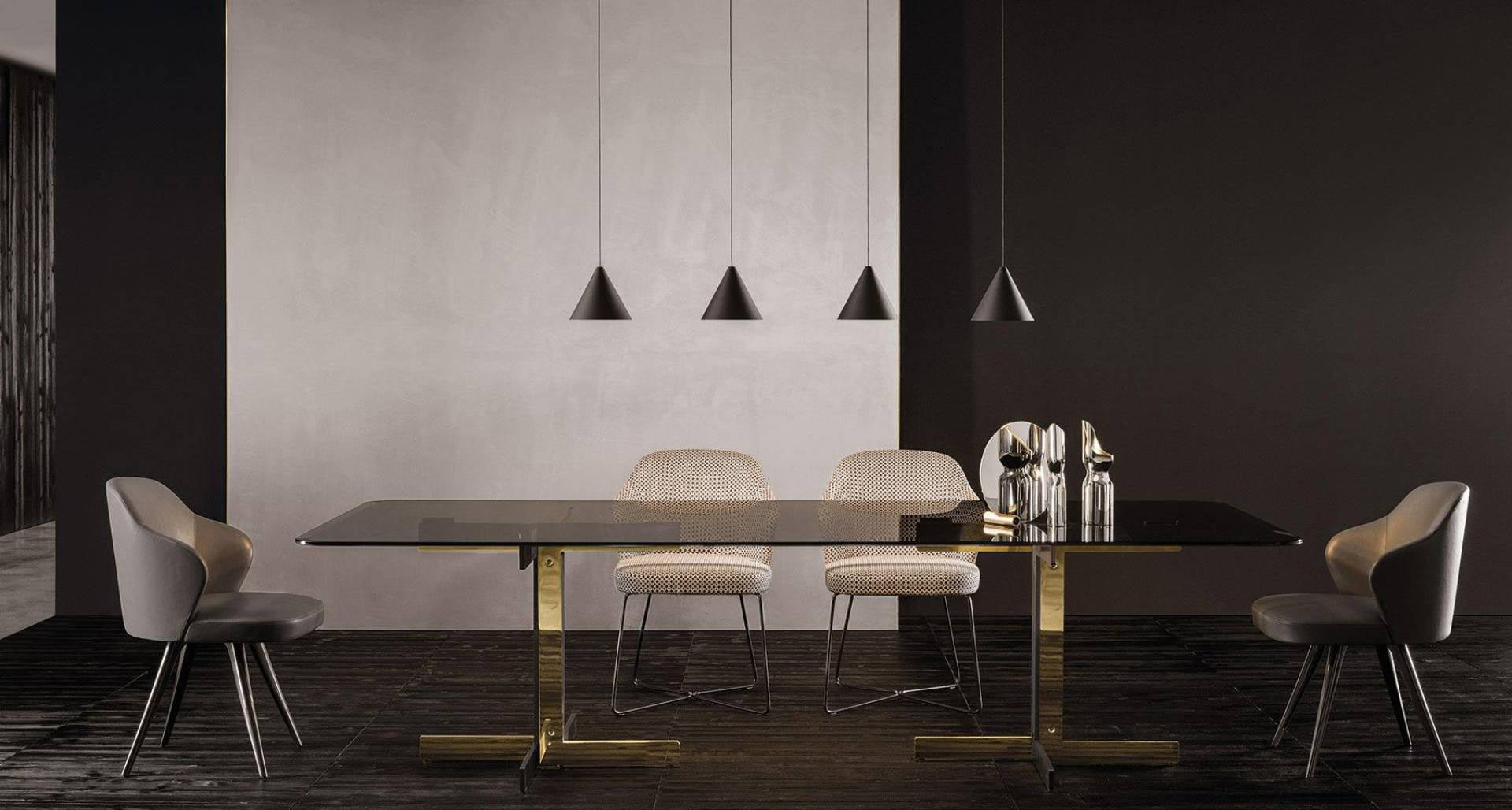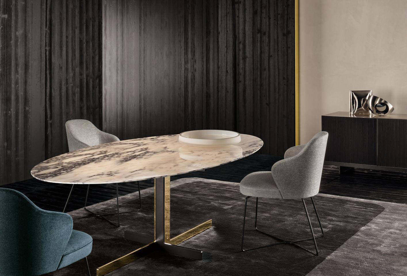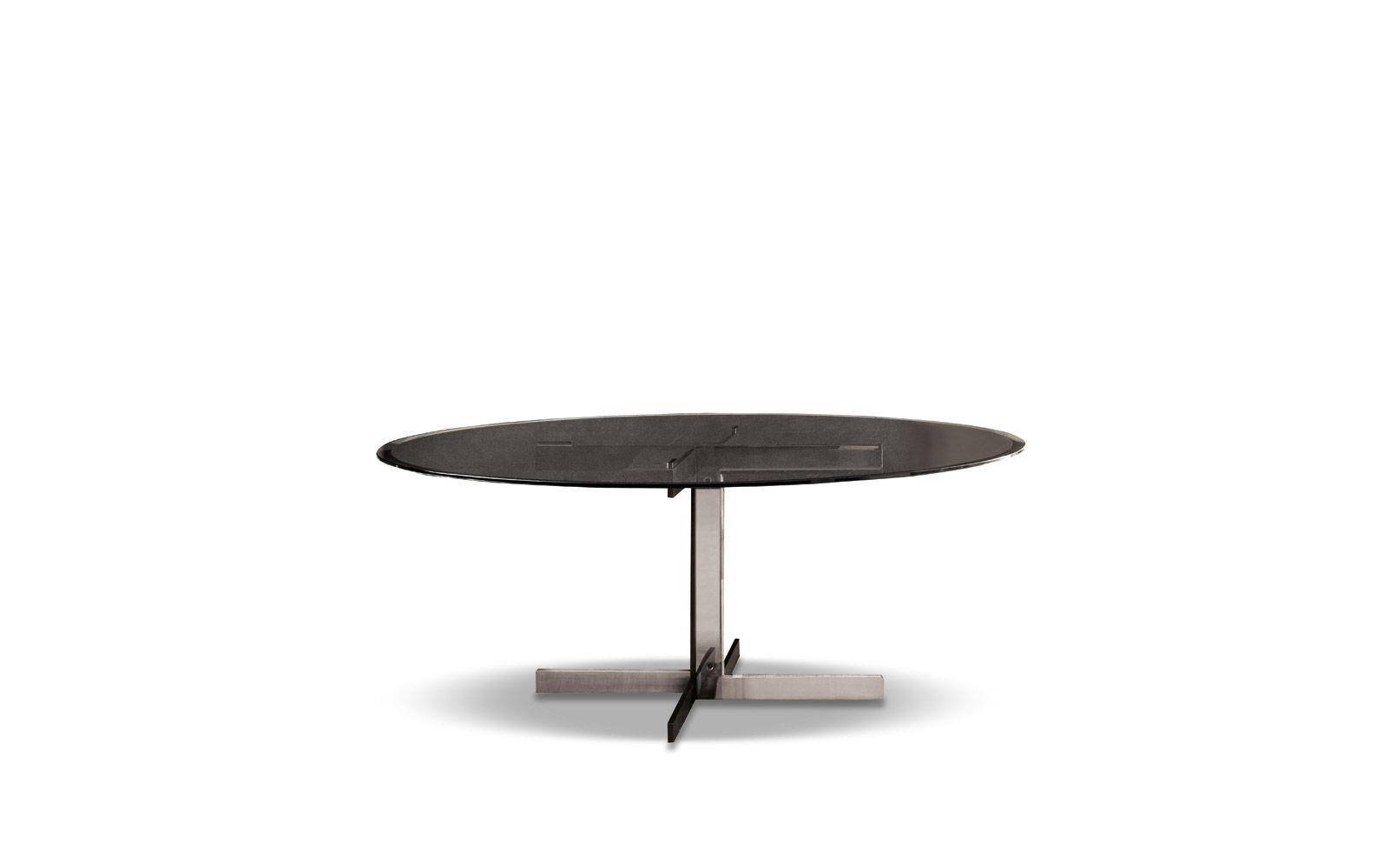 Distinctive to the Catlin collection of dining tables is the deliberately uncomplicated design of the base that is available in a surprising number of combinations of materials: textured black-painted metal combined with bright Chrome or bright Gold finish. The beveled top comes in a number of shapes - round, oval and rectangular, and an assortment of finishes - from the tactile warmth of open pore Moka lacquered oak, to the refinement of polished Arabescato Purple marble and the modern feel of Smoked Grey glass.