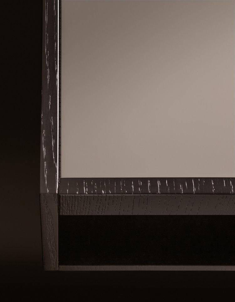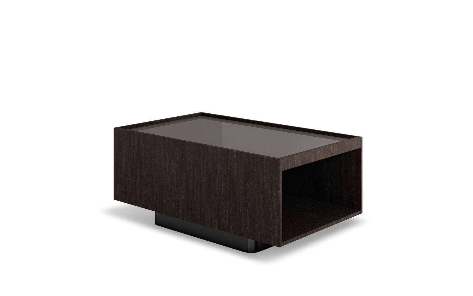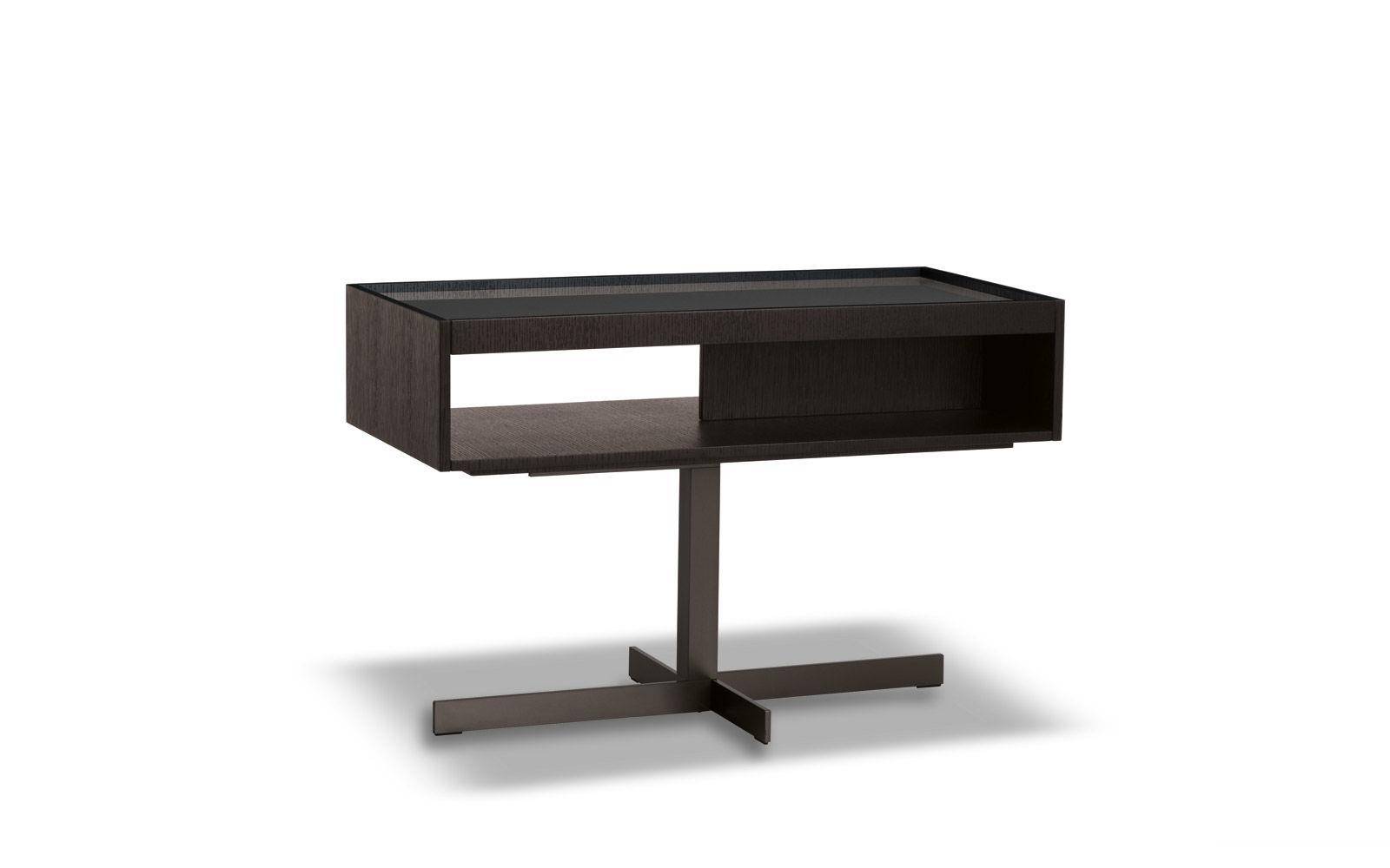 The Close side tables fit perfectly in the space between the backrests of the Yang sofa, offering practical surfaces: any useful object is within reach or tidily stored in the compartment below, while relaxing comfortably on the sofa. The simple metal base ends with a cross-shaped floor base in refined satin-finish Bronze. The upper part has a compartment with a removable tray that can be accessed on both sides and comes in two versions: structure in open pore Moka lacquered oak, a glossy Clay-colored lacquered top with inside tray in a matt Clay lacquered finish, or with a matt Clay lacquered frame and top and inside tray in oak with an open pore Moka lacquered finish. In addition to the side tables which come in various sizes, Close also includes a console table, a desk and some bedside tables.
