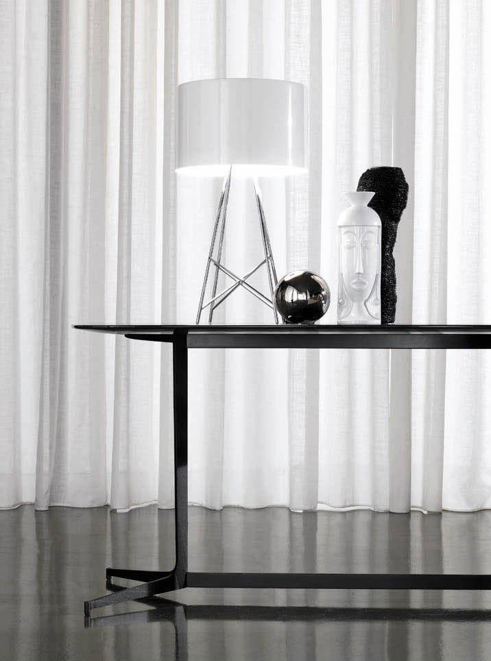 Flexible and adapt-able, thanks to the numerous sizes avail-able and the wide variety of finishes, the laser cut metal structure comes in Pewter color, with glossy lacquered tops in Mud, Petroleum, Granite and Pewter shades, or in oak with lacquered Moka finish.