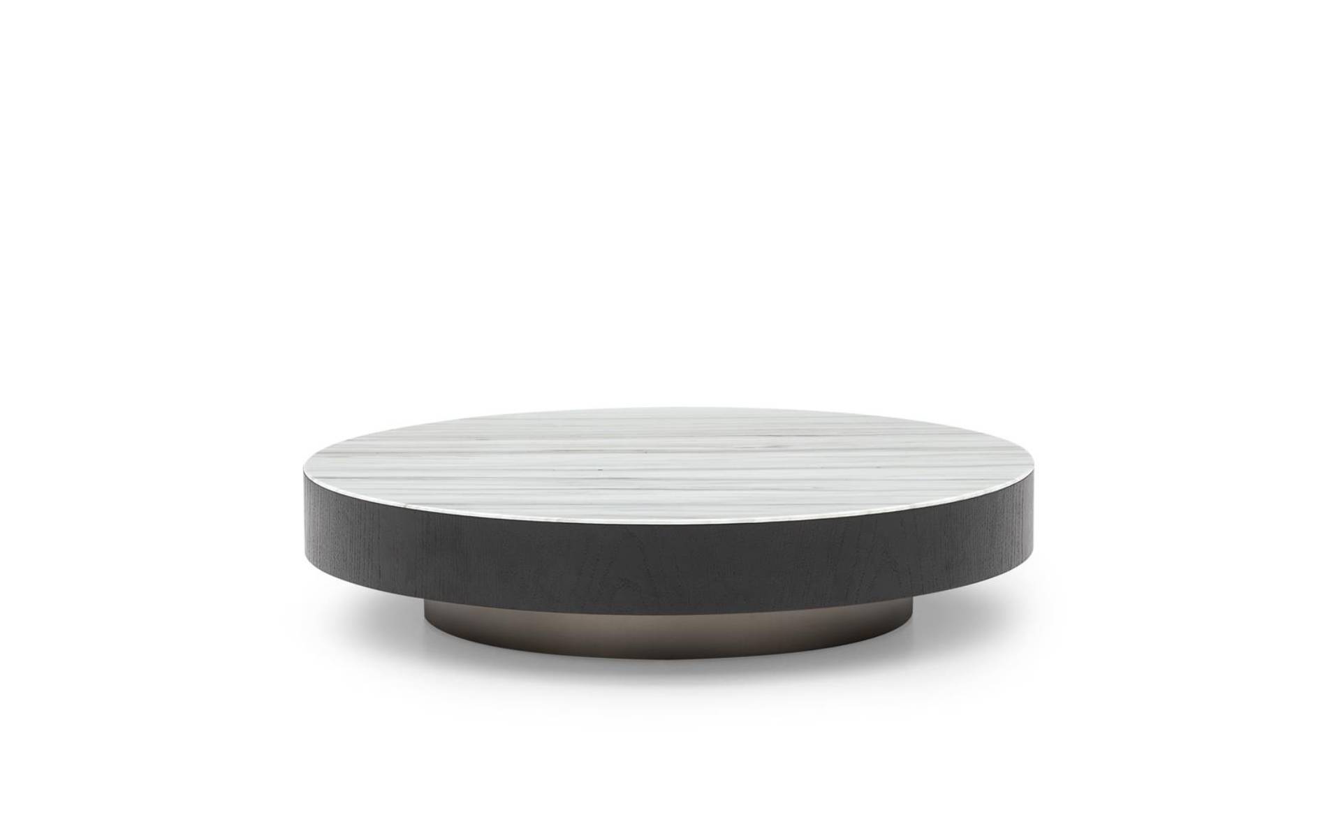 The recessed plinth in Bronze-painted satin metal transforms the supporting structure in a seemingly floating element. Closed by a band in Moka-tainted brushed oak, the frame holds the top in Zebrino marble or Black pâte de verre.