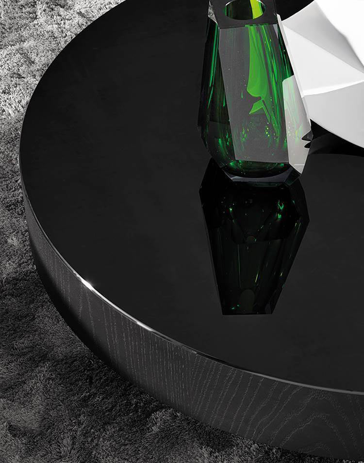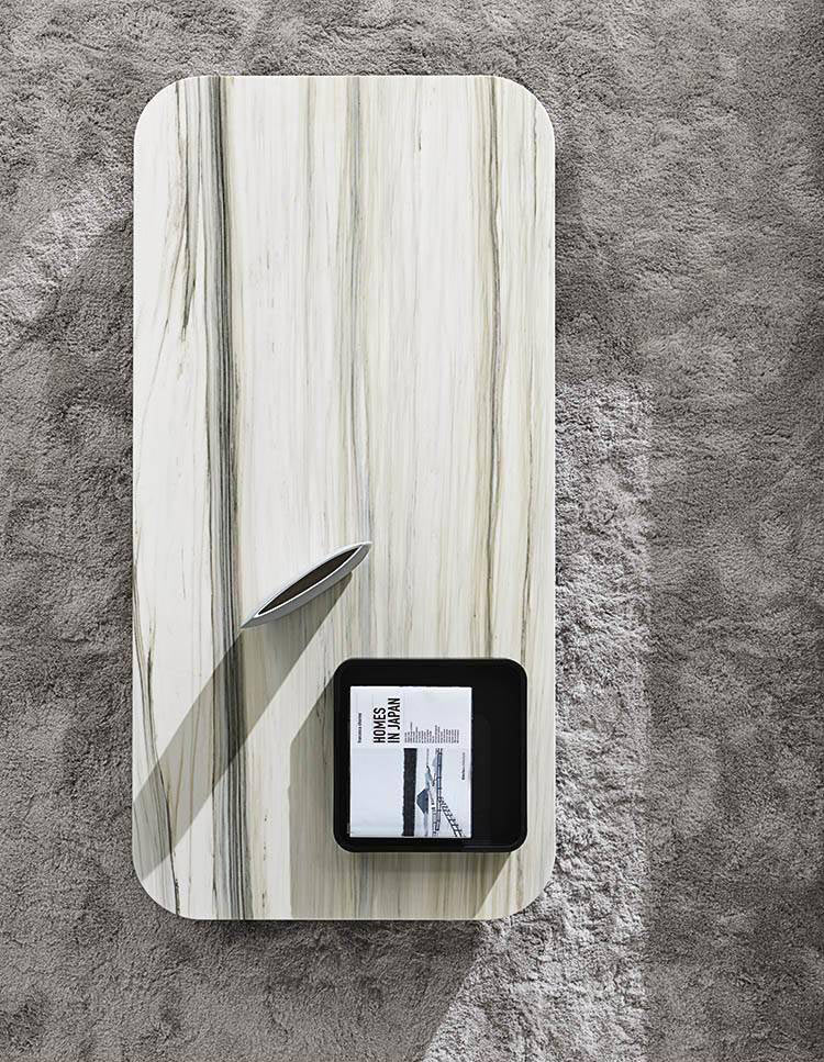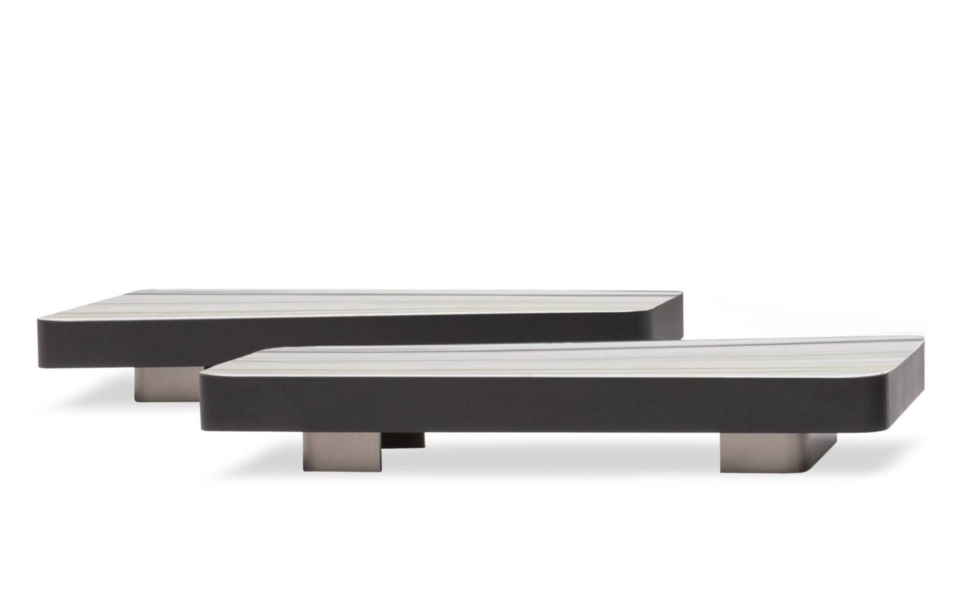 Despite the generous proportions of the tops, due to their reduced height, the tables are not invasive in the living space, but function as pleasantly decorative and functional island elements.