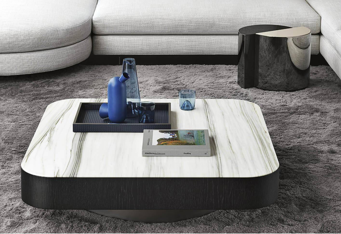 Formed by the juxtaposition of suspended geometric volumes and reduced heights, the Milton side tables are available in the circular, square, rectangular and trapezoidal versions. The geometries are softened by the rounded corners that recall the sinuous curves of the Alexander “Drop” seating system. Characterized by a more contemporary and decorative reinterpretation of the lines of the Seventies, they showcase a refined game of combinations of precious materials and organic geometries.
