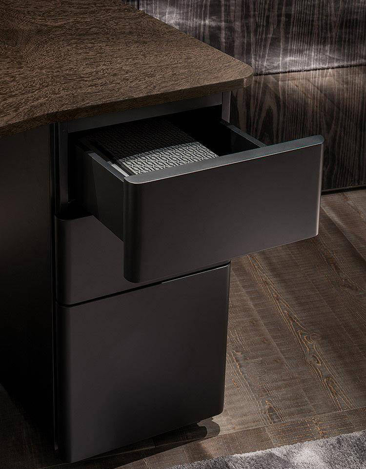 In addition to accent tables, the Jacob family also includes a writing desk with the top in Sand or Mud glossy lacquer finish, or in Sucupira veneer with stained Mink finish. The writing desk also has a convenient chest-of-drawers in wood with matt black lacquer finish.