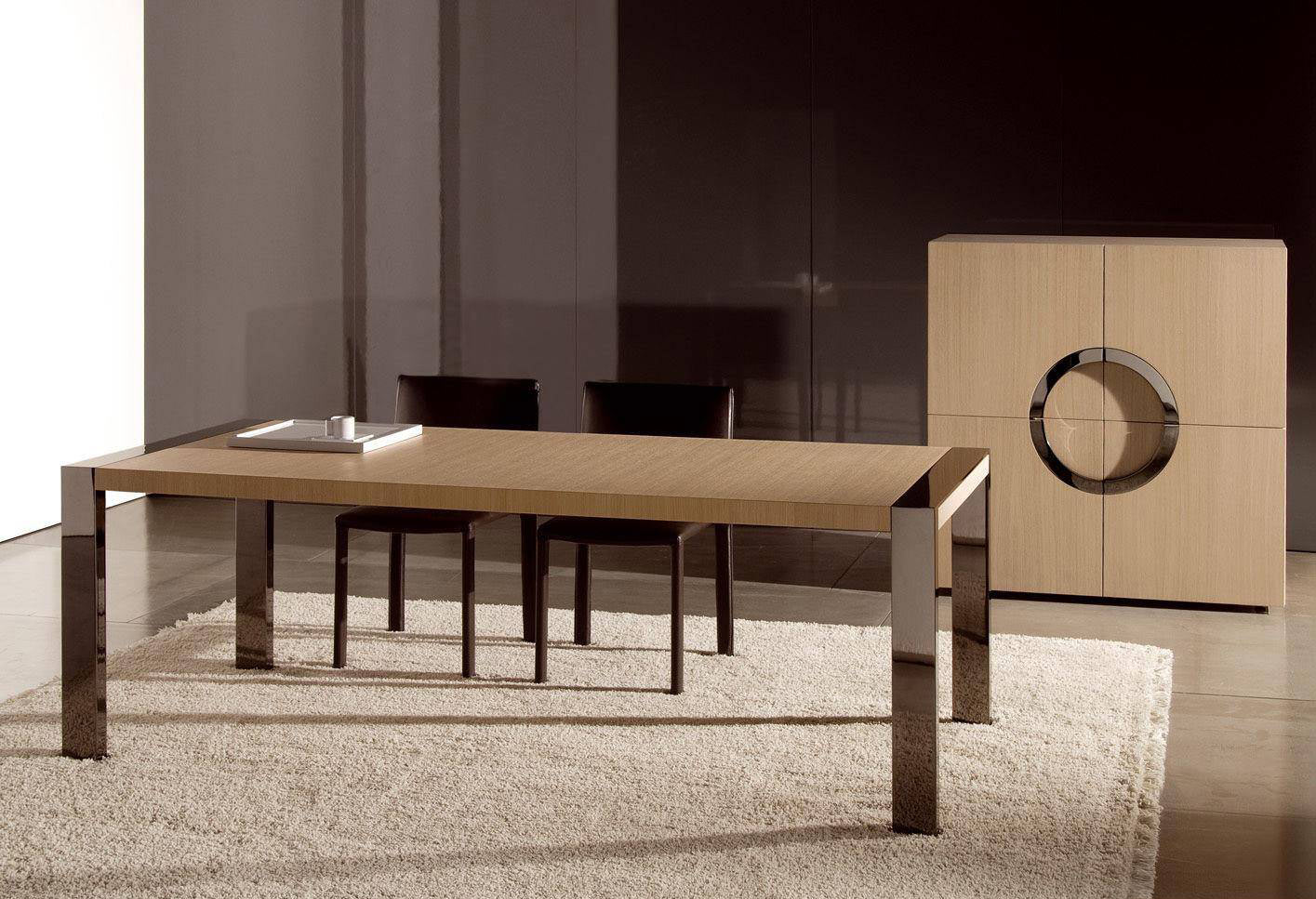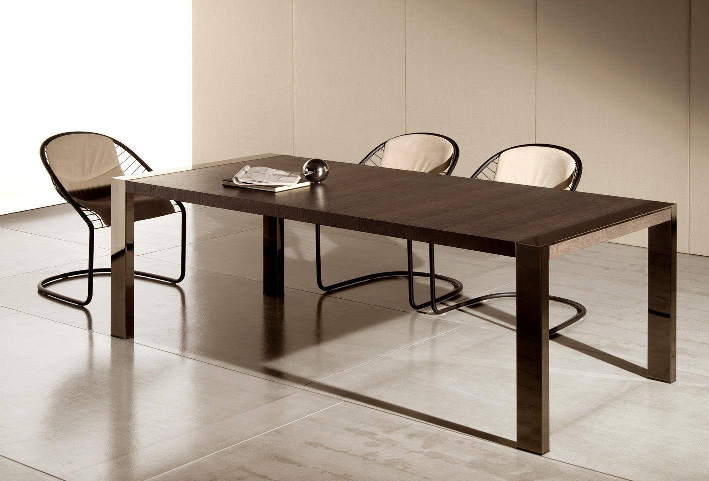 Table tops in glossy lacquer in various colors or natural brushed oak, open pore stained oak with Grey finish, open pore lacquered oak in Moka or Black can be paired with metal legs in Black-Nickel or chrome finish.