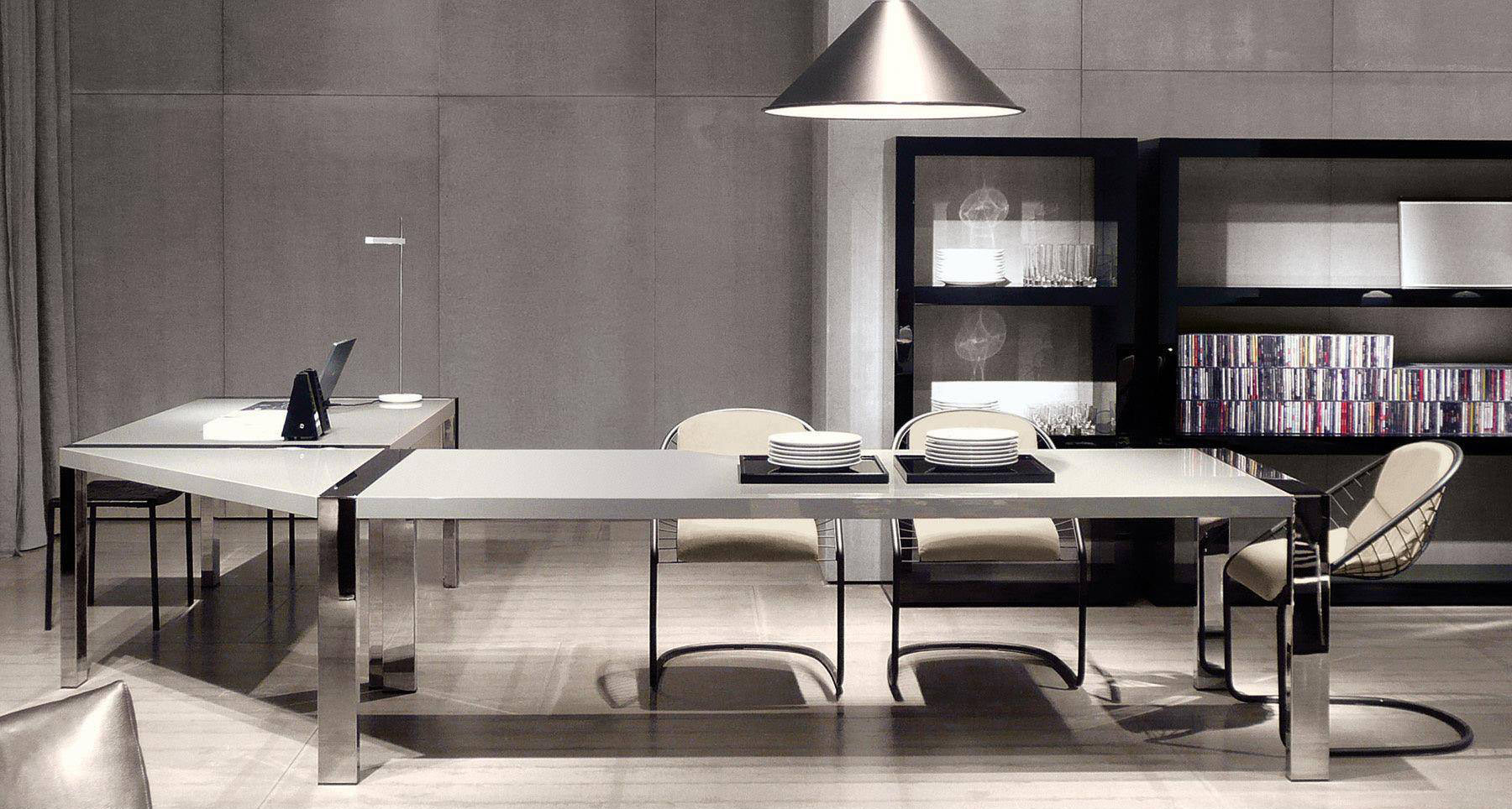 A collection of modular tables, imbued with pure, refined beauty, and designed using an intelligent system that allows them to be grouped together to create traditional tables, or office tables with combined shapes and emphatic sizes.