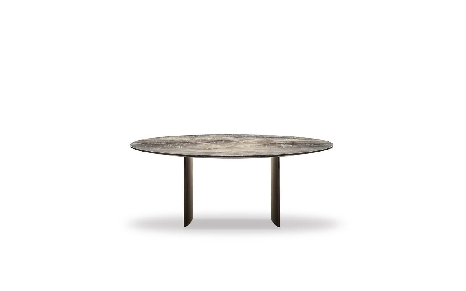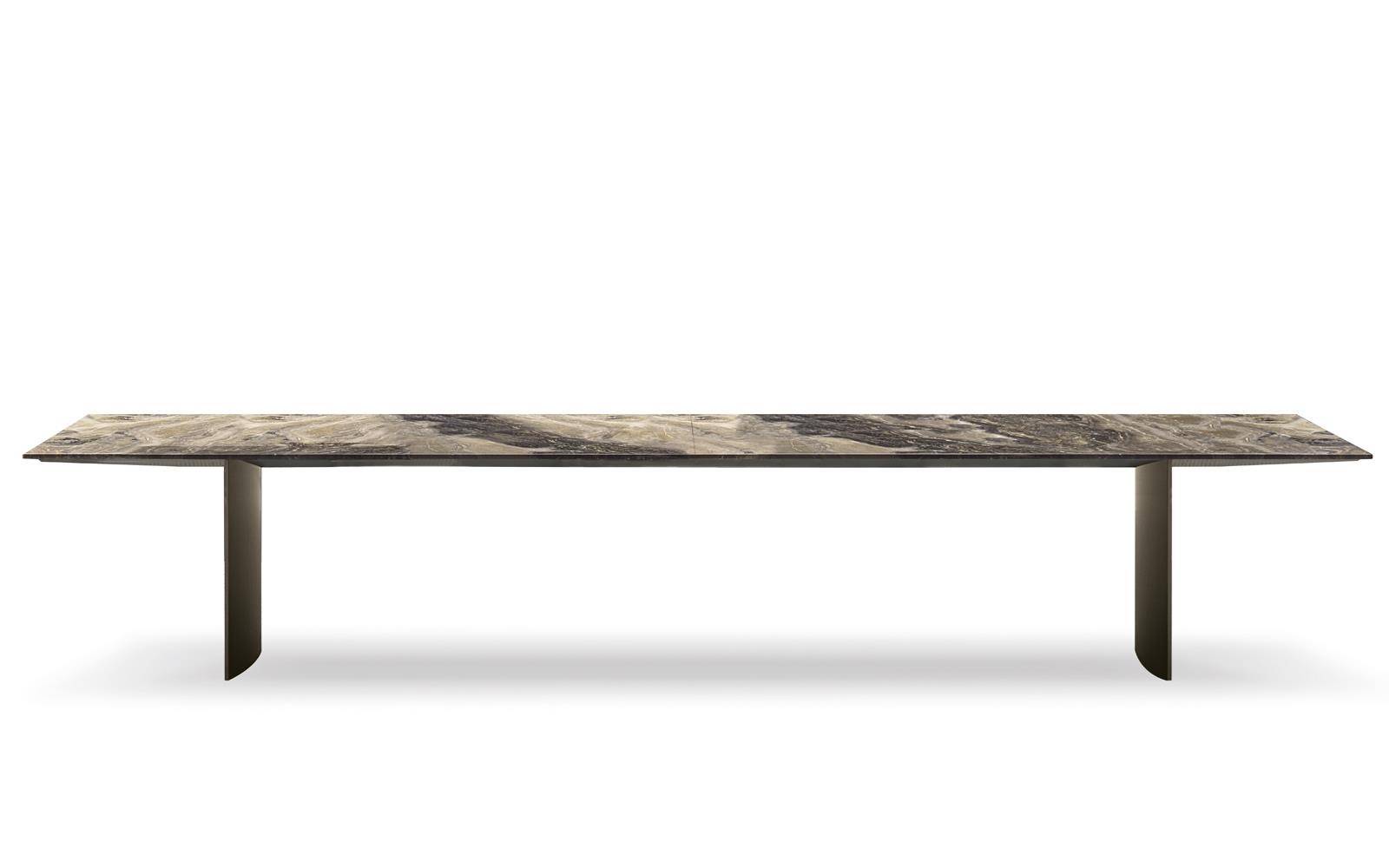 In the more sculptural version, the structure designs a bridge, with the top being flush with the sides, whereas in the other tables the blade-like legs, with the section curved on the inside, are set back from the top.