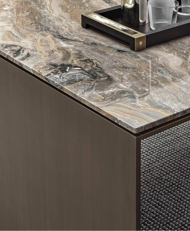 The stratified bearing structure with matt black lacquered finish features aluminium sides with Golden Brown finish and a top in Grigio Orobico marble.