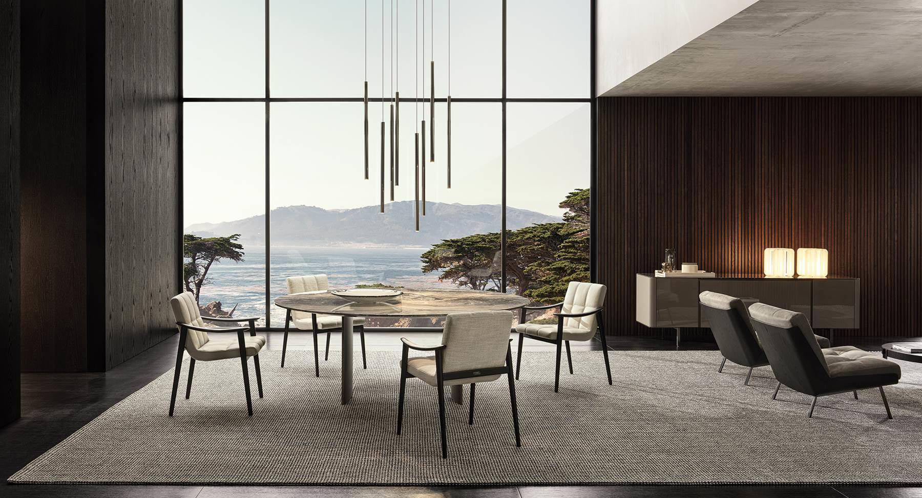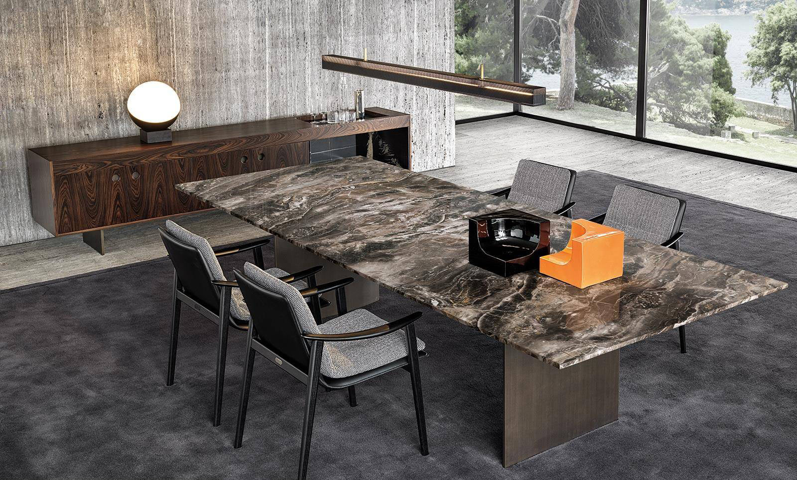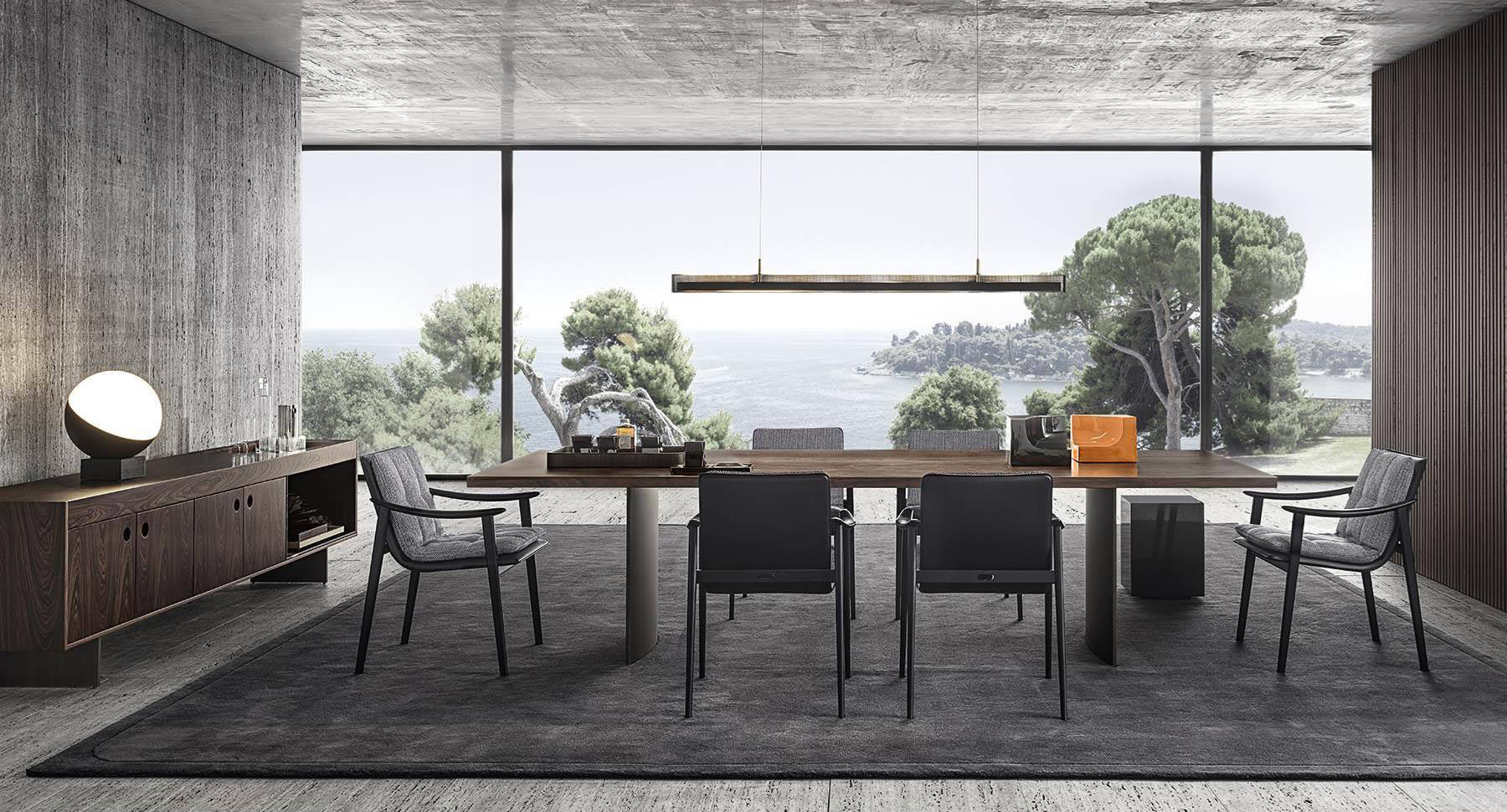 For the 2020 Collection, Marcio Kogan further strengthened his creative partnership with Minotti by proposing, for the first time, three indoor designs: the Daiki armchairs (available also in the outdoor version together with  the dining little armchairs), the Boteco family of sideboards and the Linha tables and coffee tables. The designs incorporate evidence of his trademark minimal style, defined by rigorous lines and shapes, which at the same time express a sophisticated choice of finishes and fine materials.