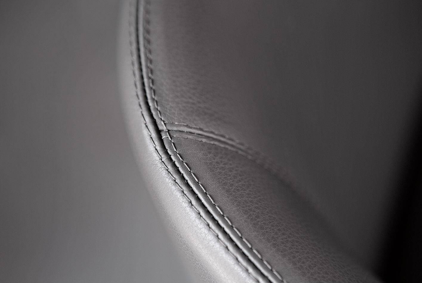 The enveloping backrest has a heat-molded structural polyurethane outer shell combined with a high-density flexible molded polyurethane layer. The long, slender legs are made of solid Sucupira with stained Mink finish or solid ash with open pore Moka lacquered finish.