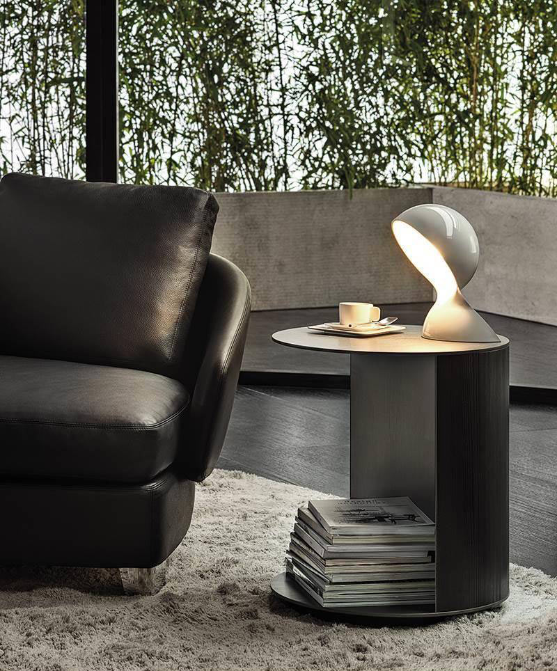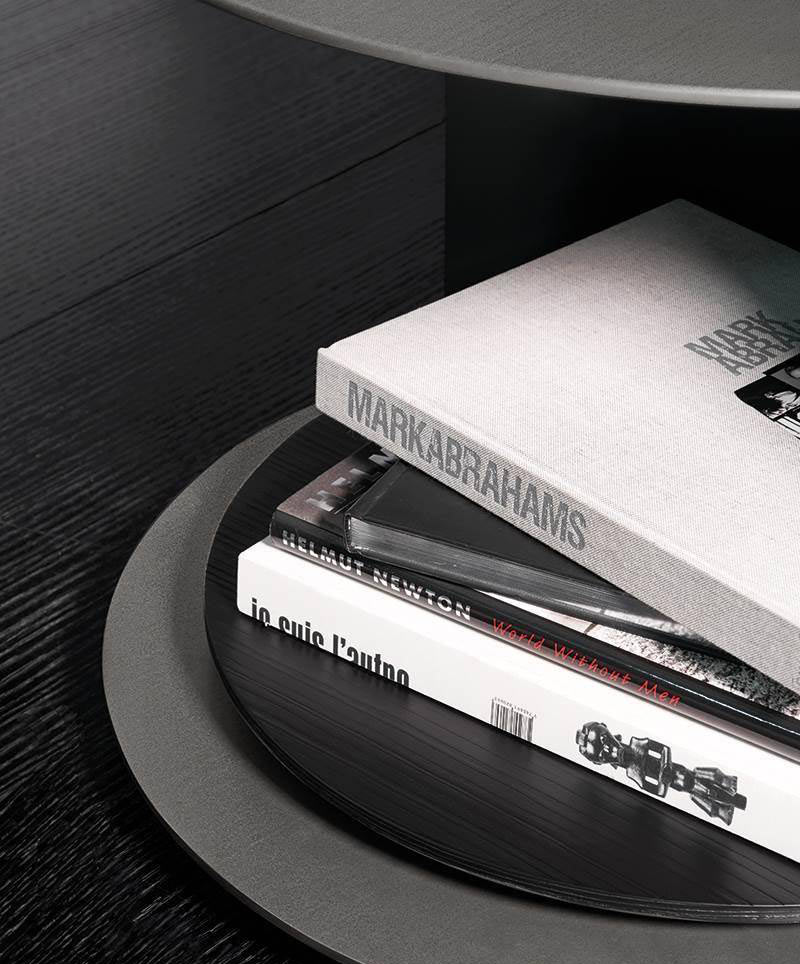 Its lightweight look and rounded forms make it ideal for occupying the space beside a sofa. It comes in two sizes, with different diameters and heights. In the shorter version, 44 cm tall, Richer unveils a surprise: a rotating disc positioned at the base, designed as a Lazy Susan tray, bringing the objects placed inside it into easy reach.