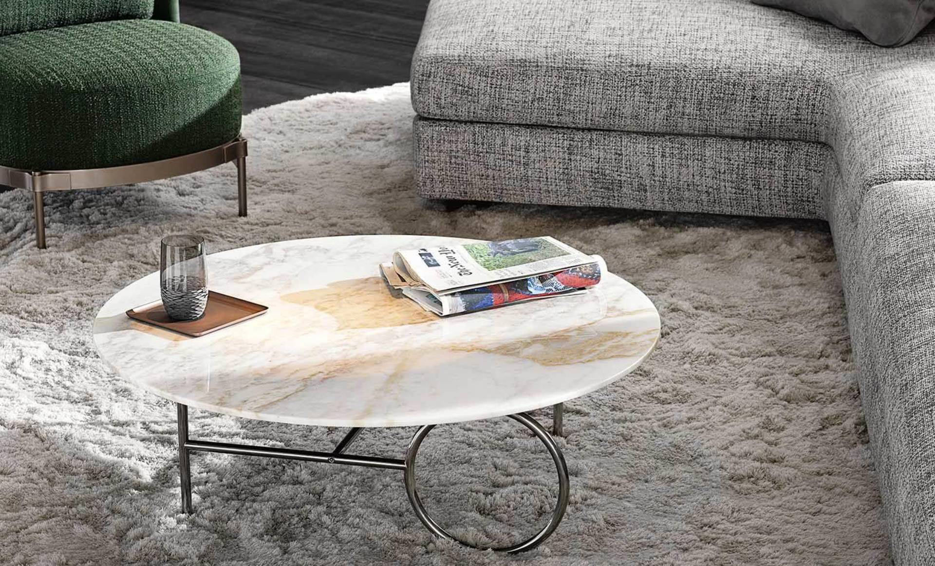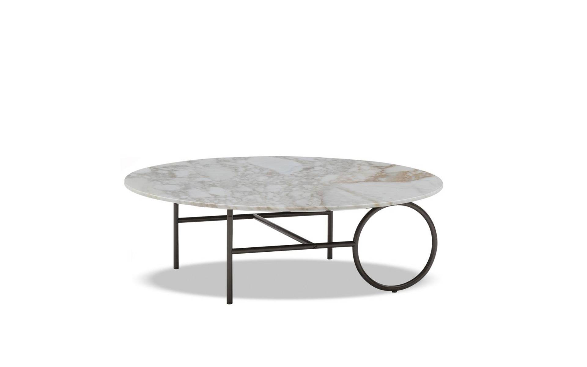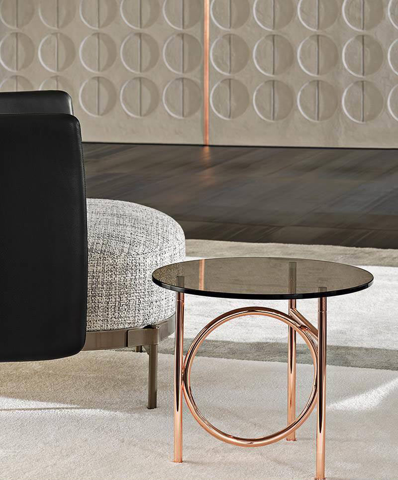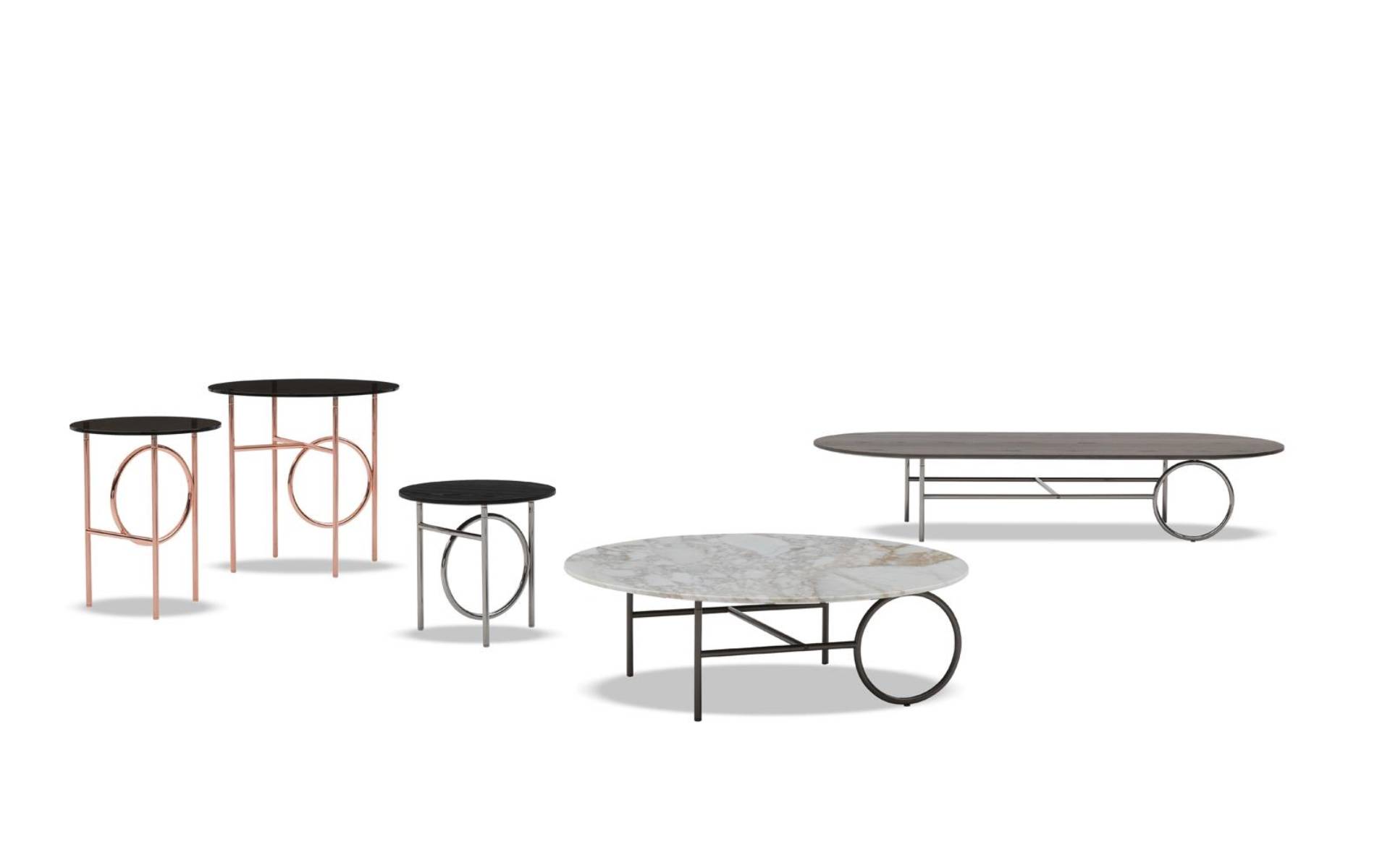 The metal frame, available in Bronze, Copper or Black-Nickel, comes in different heights. The Ring tables are completed by an oval or circular top, with various diameters, which are customizable in bronzed glass, Calacatta marble or Licorice brushed ash.