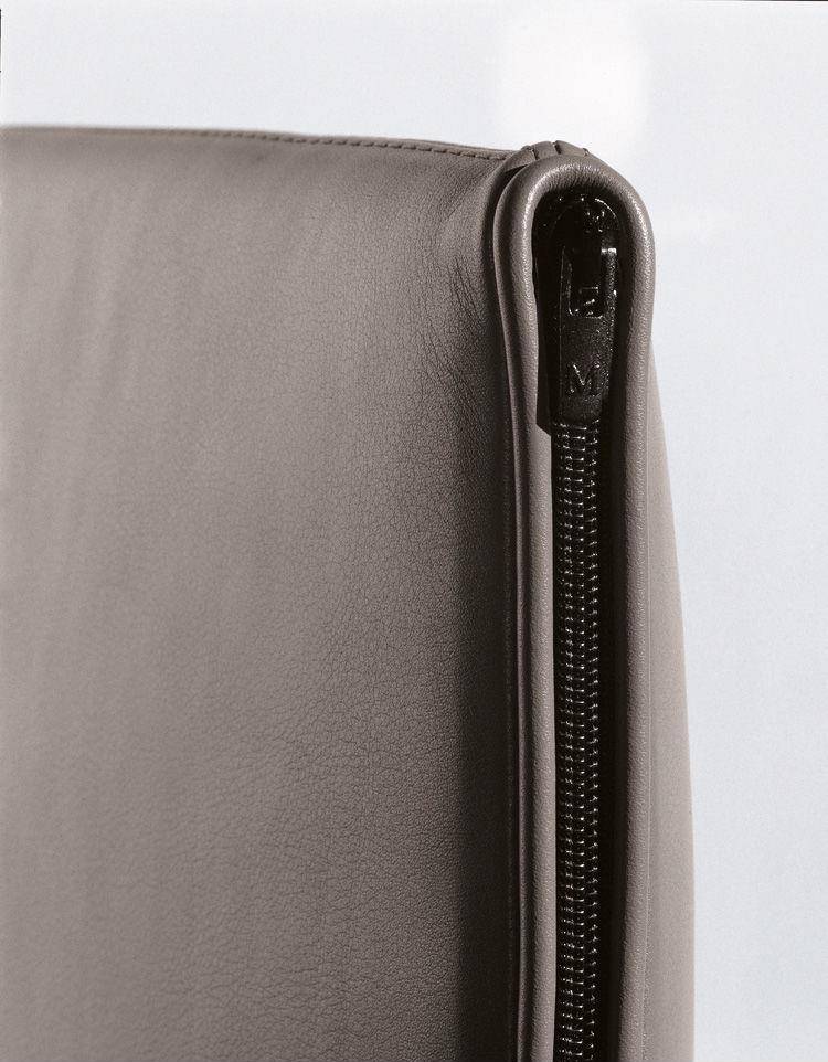 The chair is crafted with exposed zippers located along the side of the chair, finished with piping in the same color as the leather upholstery.