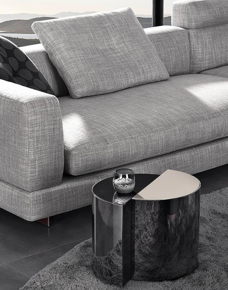 An interplay of black and white characterizes the two offset semi-circles, both on the top and on the internal vertical section, thanks to the contrasting shades between the Pewter glossy-lacquer and Sand.