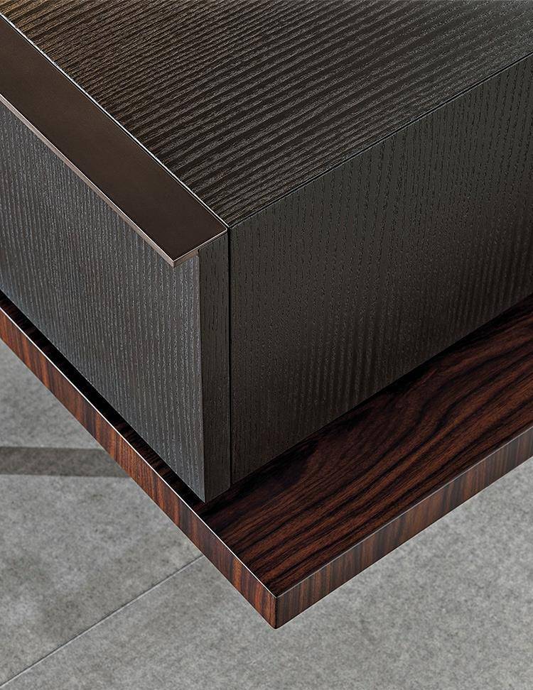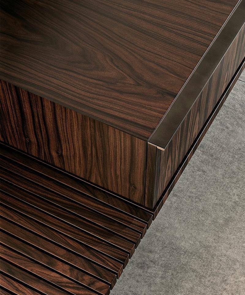 In the first two variants, the body of the unit rests on a solid wood base. Sporting volumes of different sizes, it comes equipped with drawers, all with handles in a polished varnished Brandy-coloured finish.