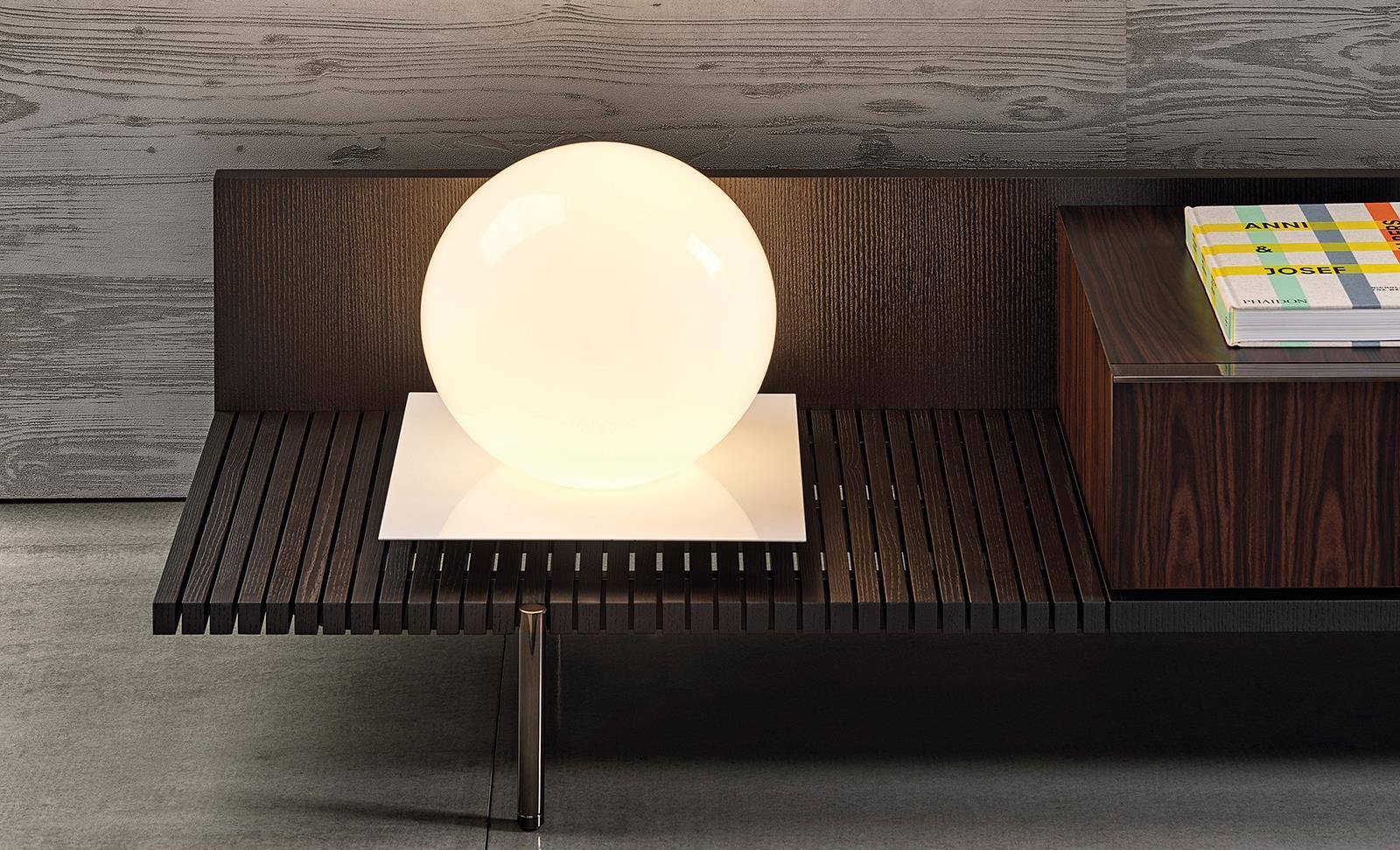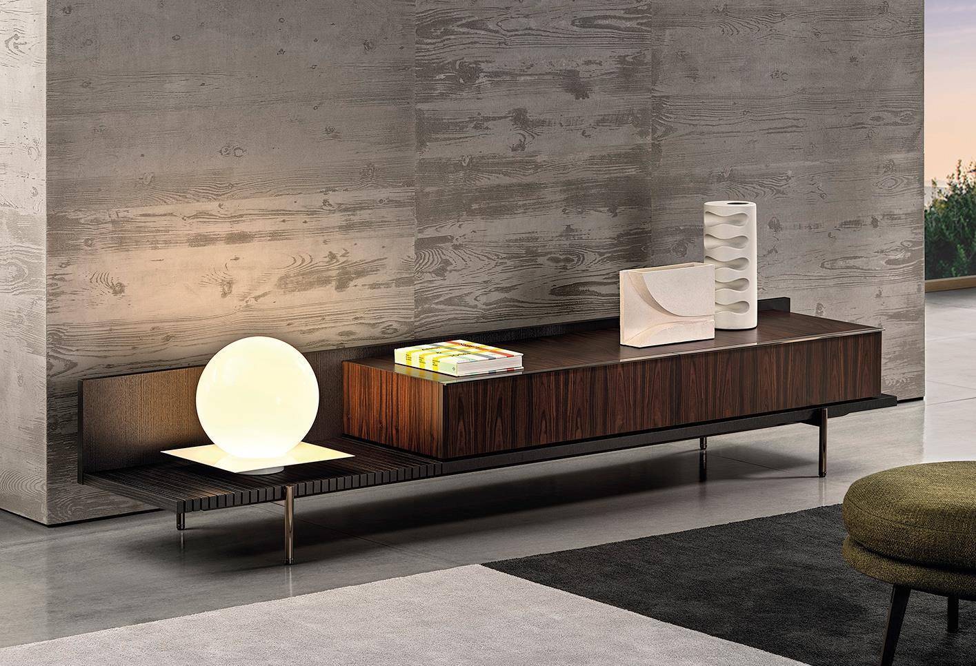 The living/TV unit, available in a single 273,5 cm version, offers a storage space with two drawers and surface made of thin staves in Dark Brown stained Canaletto walnut that lighten the volume and create an original interplay of transparencies.