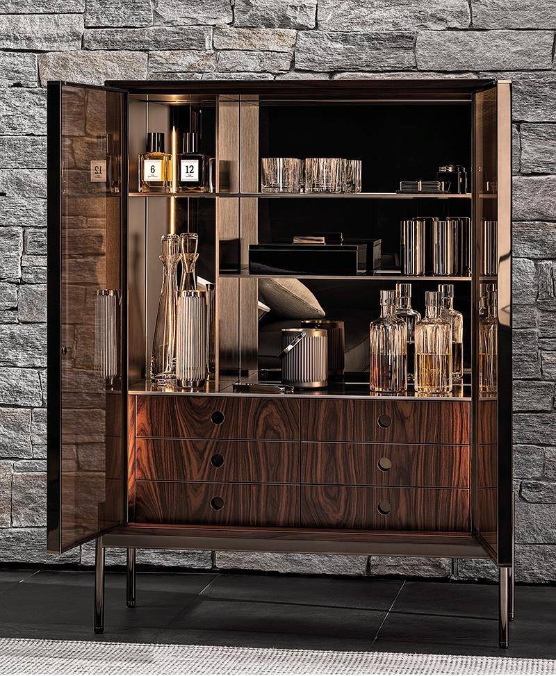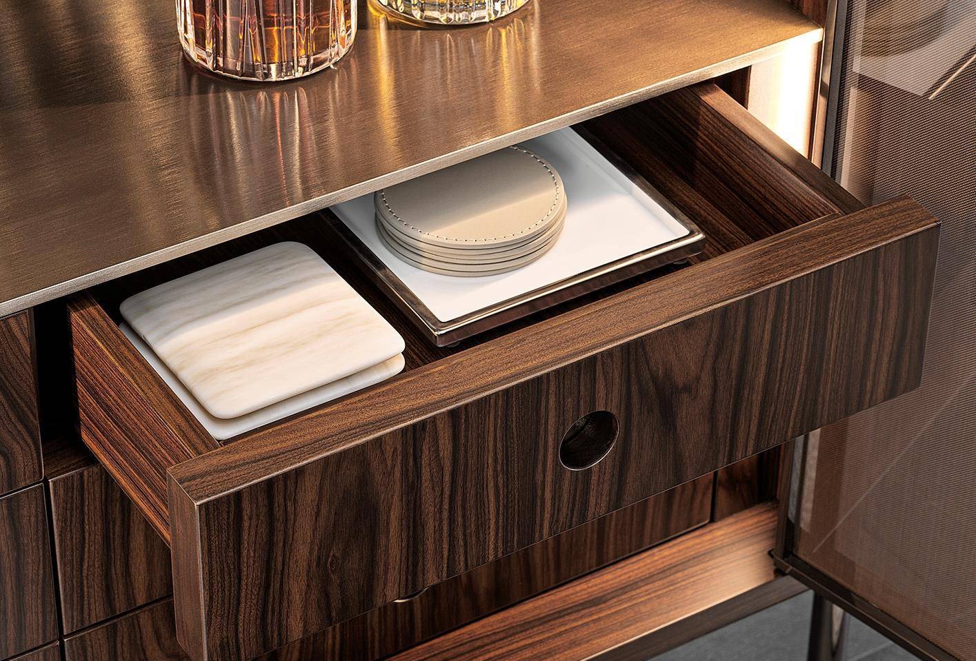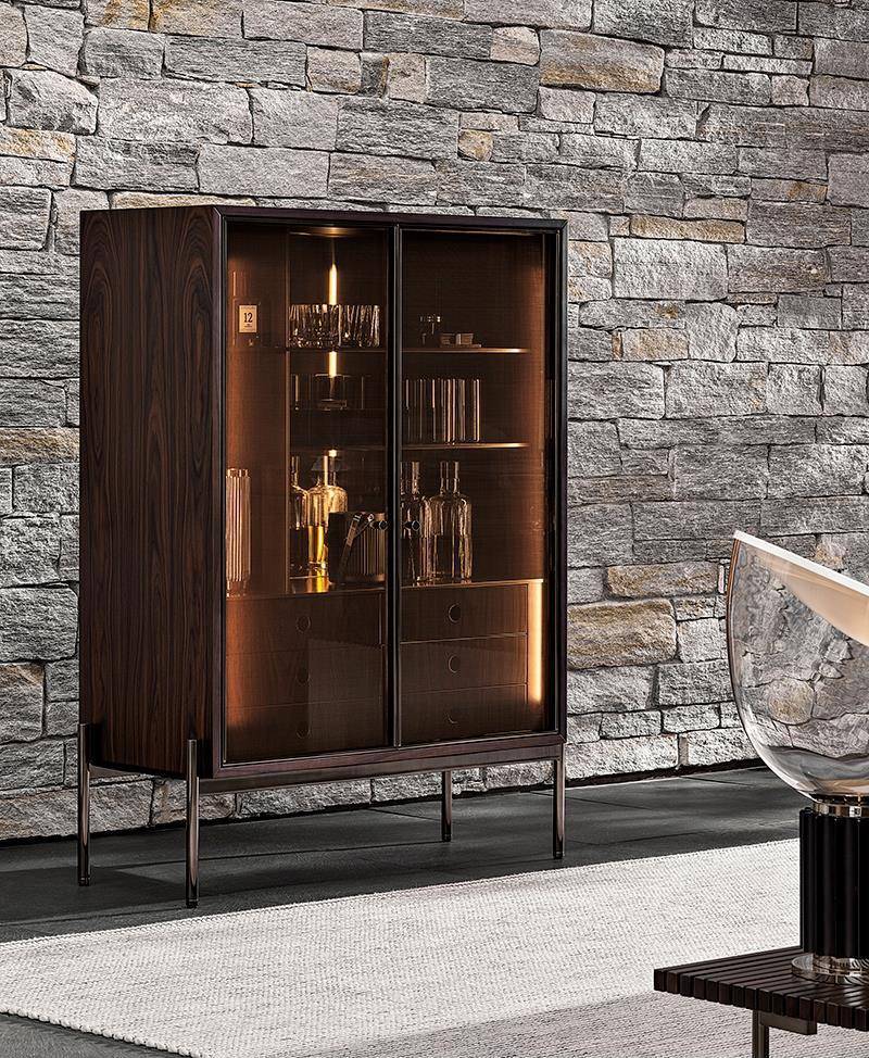 The cabinet, available in one size, 105 cm, is characterized by a frame with doors in stratified glass, coupled with a copper-coloured metallic mesh inside. This combination offers glimpses of the reflections created by the back panels in bronzed glass and by the double light strip, positioned on the sides of the frame. Inside, it houses a set of drawers in Dark Brown stained palisander Santos, with matt polyester lacquered finish.