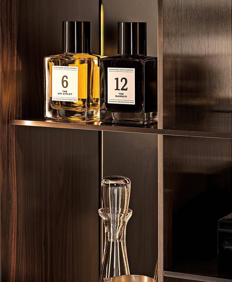 The cabinet, with its pure and geometric shapes, emphasizes the sophisticated combination of materials, creating a refined contrast between wood, varnished aluminium and glass.
