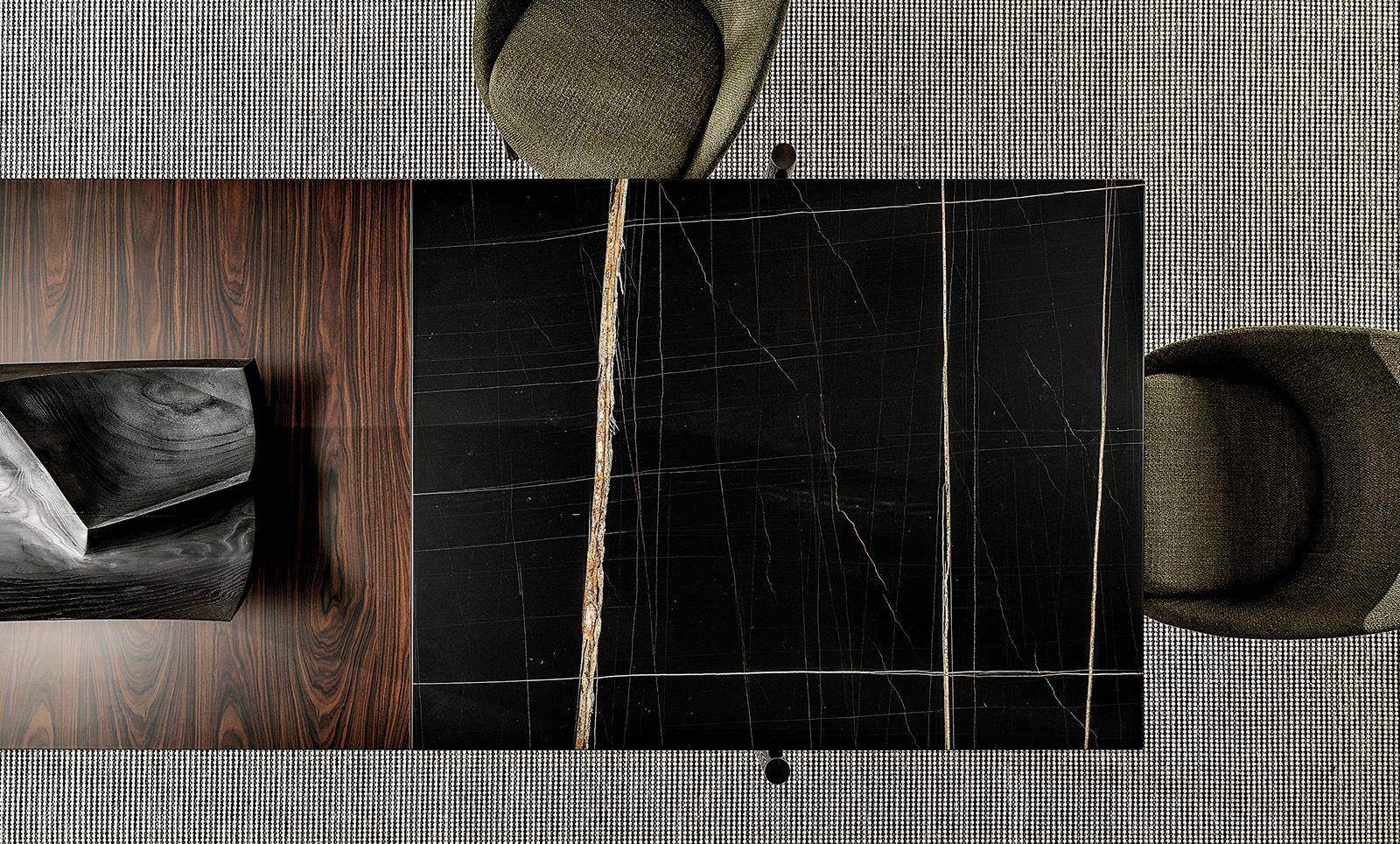 Available in four sizes, from 250 cm to 400 cm in length, it enhances the aesthetic and textural properties of the Dark Brown stained palisander Santos with matt polyester lacquered finish and the Black lacquered open-pore flamed ash, as well as of the Dark Brown stained palisander Santos combined with Sahara Noir marble with matt polyester varnished finish.