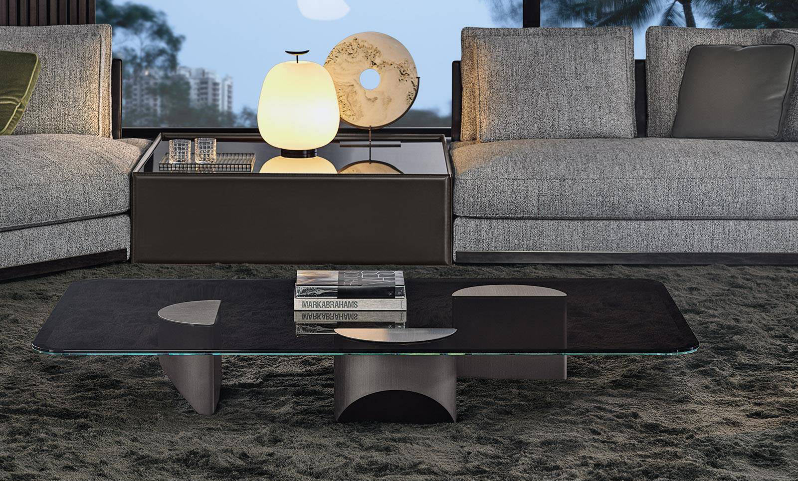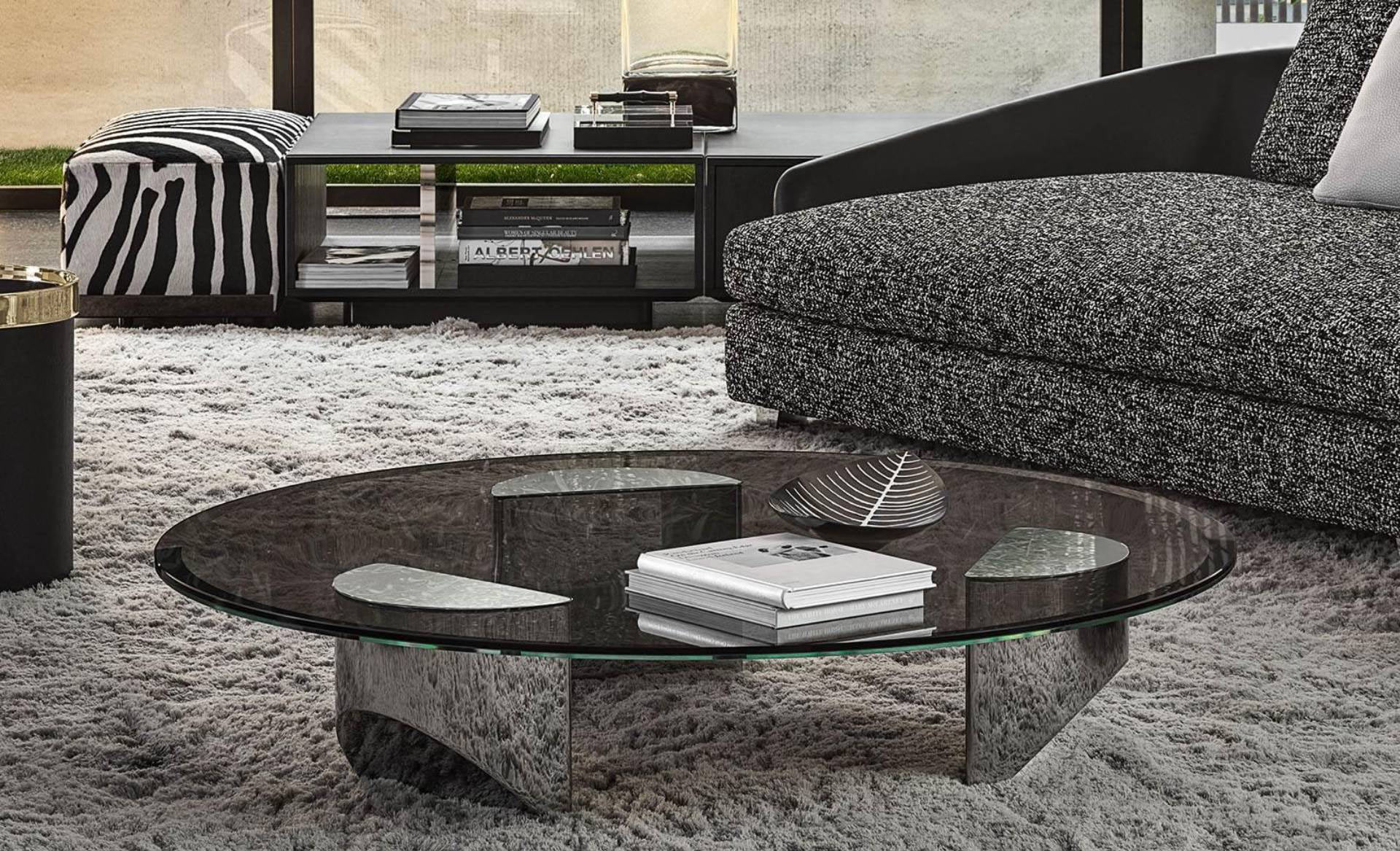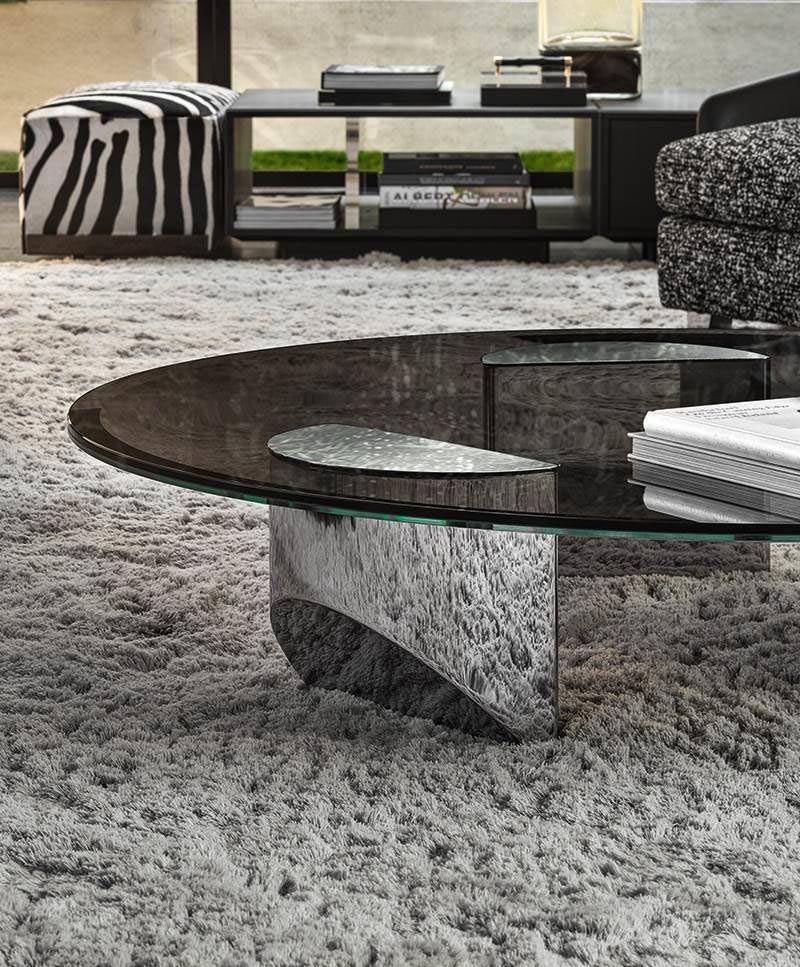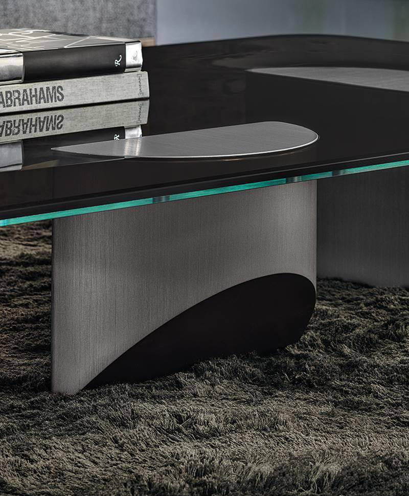The oblique chisel tip shape sported by the bulky volume of its semi-circular legs significantly lightens the impression of the coffee table, creating the idea of a support on tiptoe.