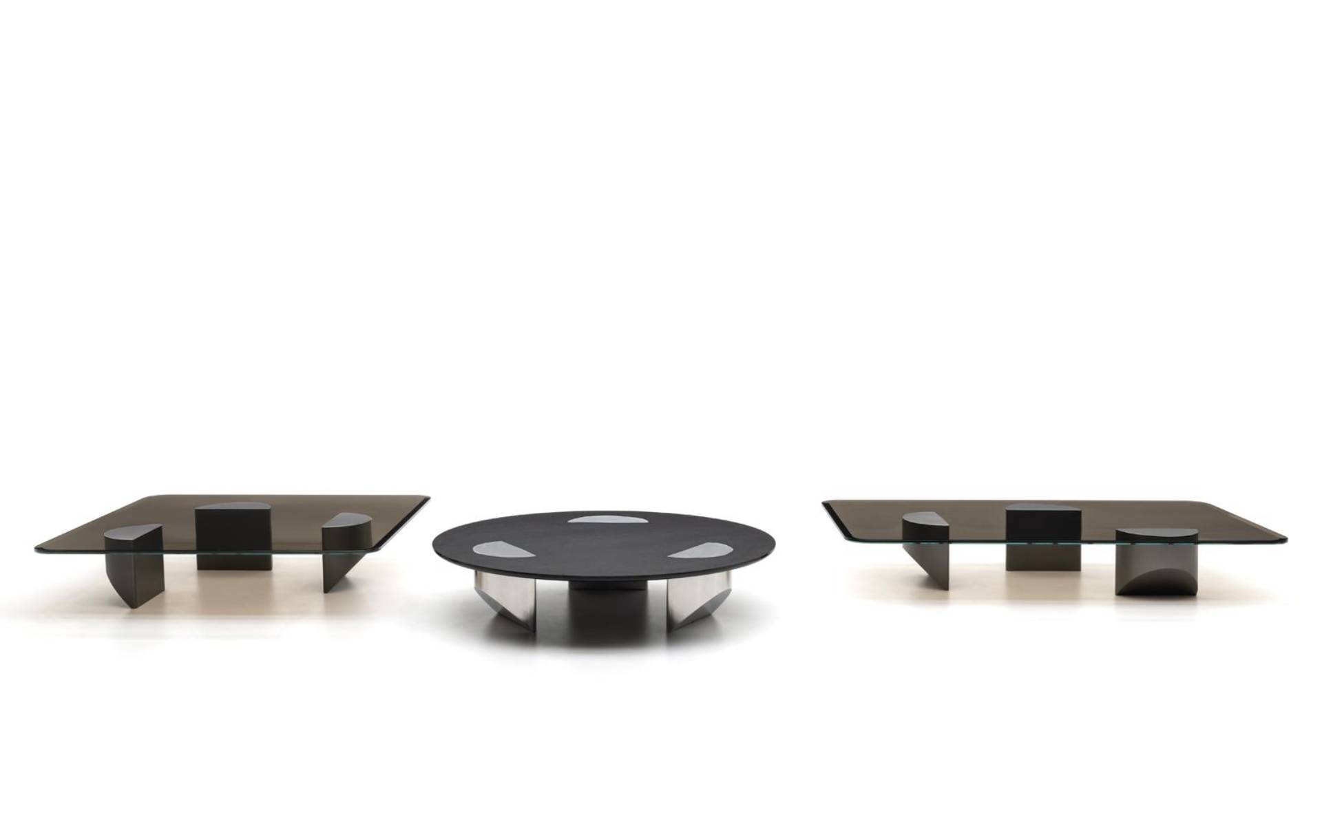 An unexpected visual effect that reveals the stylistic tone of the designer, a design concept bent on the desire to innovate and amaze. The same style can be found in the design of the top, available in both glass and wood, through the surface of which the semi-circles of the three supports are visible. Wedge features a large top - in round, square and rectangular versions - in bronzed glass or Moka-coloured Louro Faia wood, with a unique hammered effect texture. It is supported by legs with a polished steel or satin metal finish in Malt colour, appearing to perforate the surface while remaining level to it.