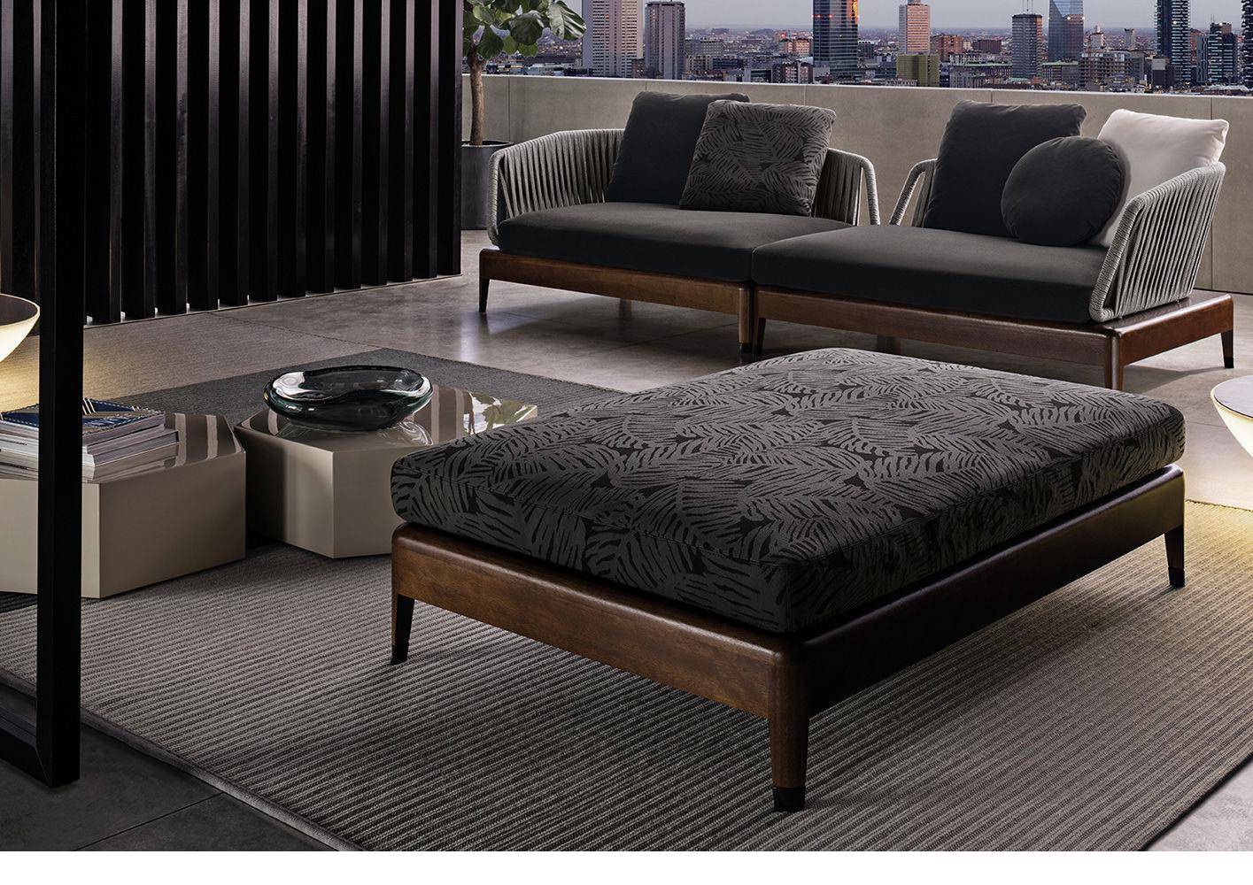 The Indiana family comprises numerous pieces - sofas, end elements, chaise-longue, ottomans, coffee tables - with their base in solid iroko, intricate hand-crafted dovetailing and finishing details, and available in both natural iroko and “Dark Brown” stained finish.
